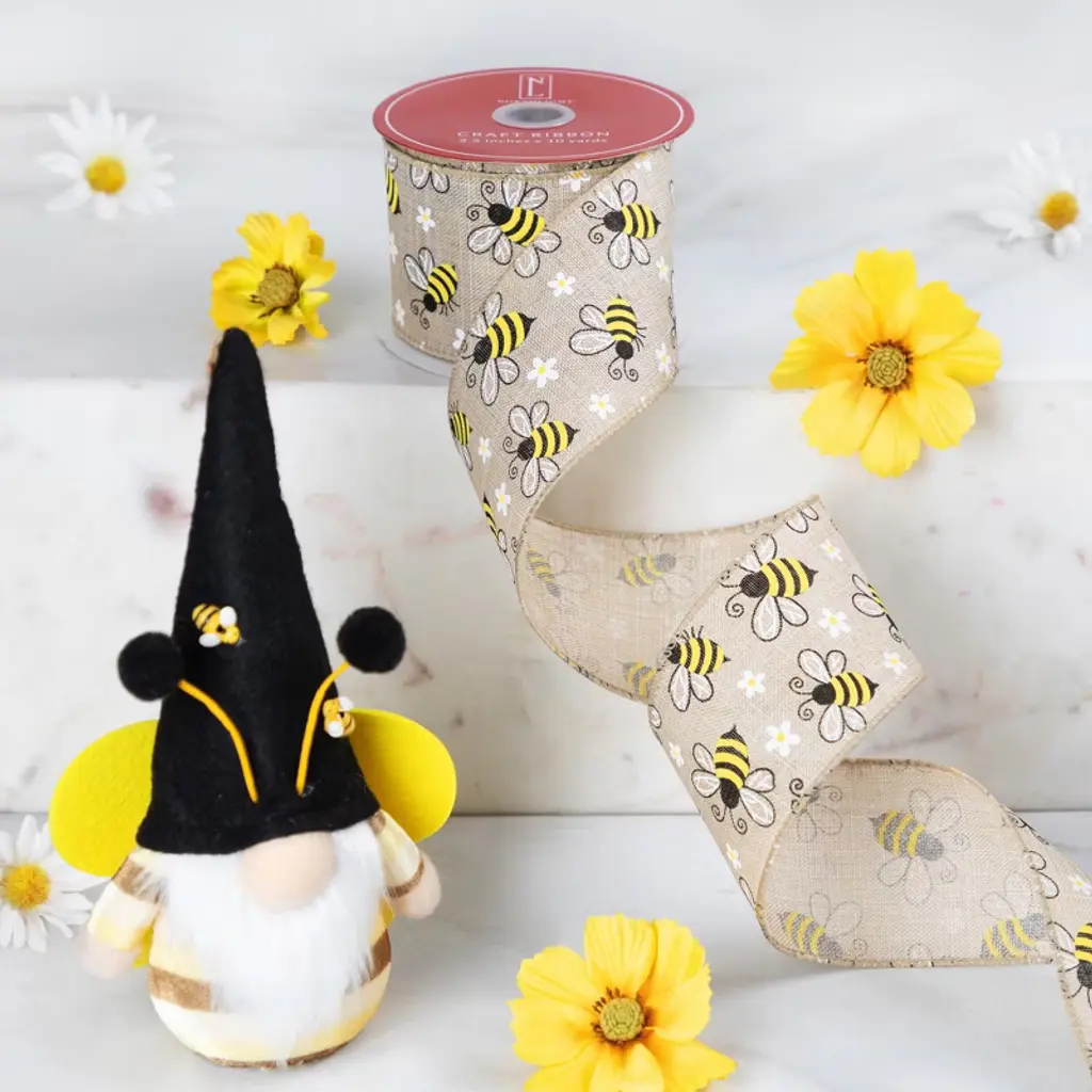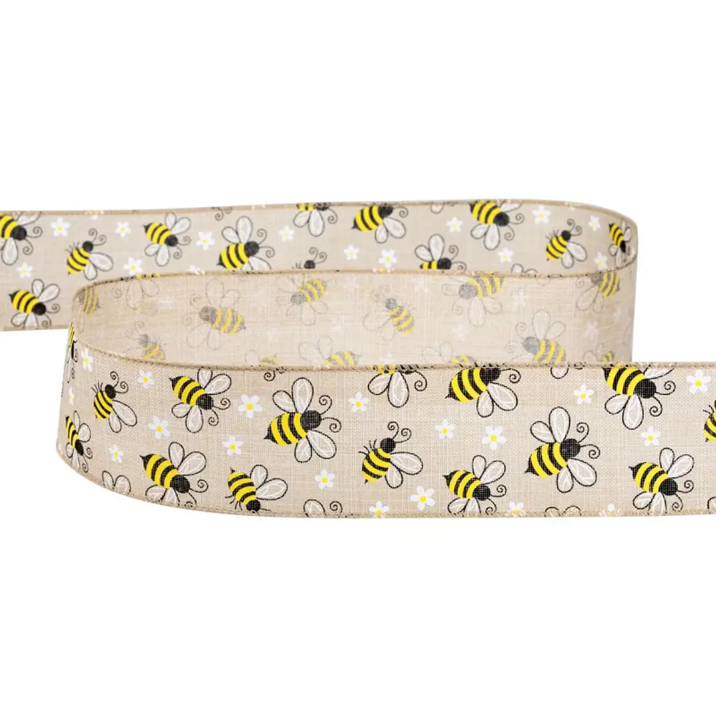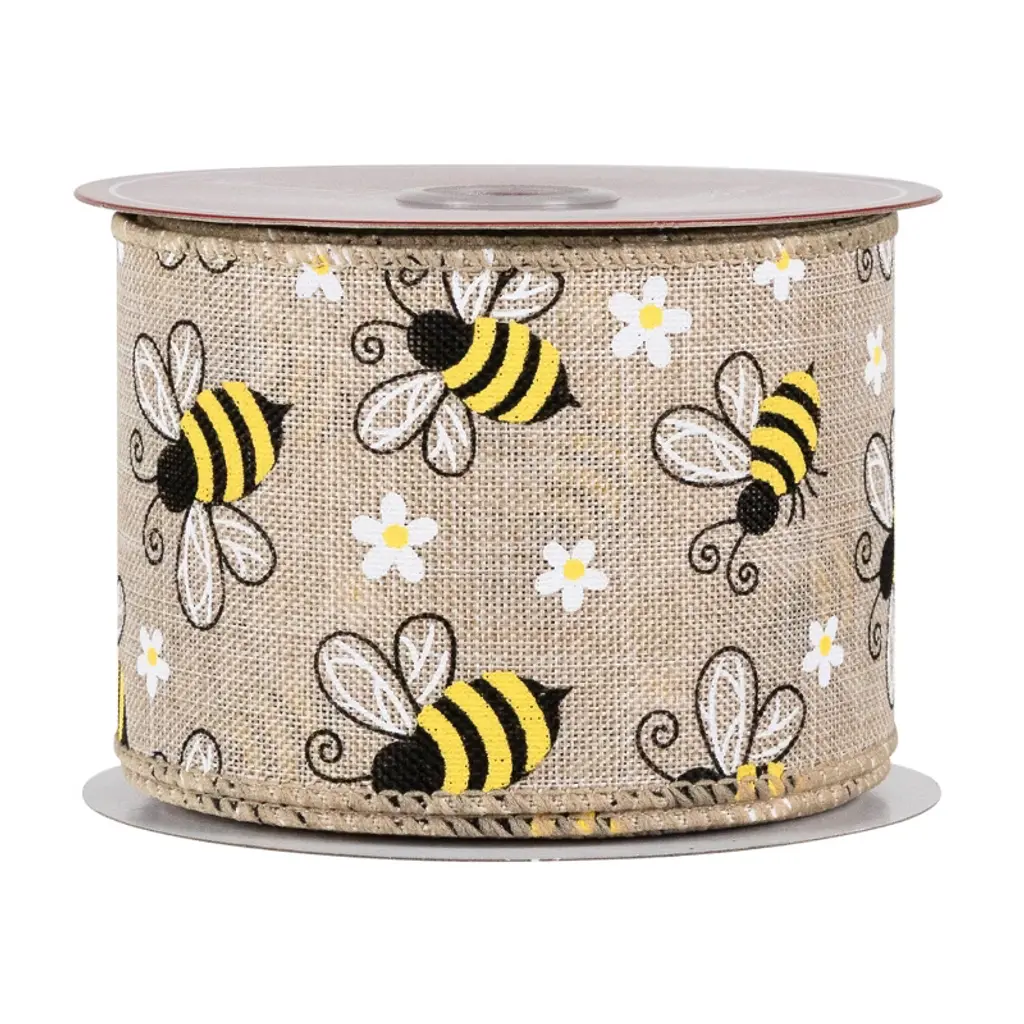 Product Features: Natural burlap spring crafting ribbon Features a bumblebee and daisy flower design Design is on one side only Sewn wire edged ribbon allows you to bend and shape your creations to decorate with ease Ribbon comes on (1) spool Recommended for indoor use only Dimensions: 2.5" wide x 10 yards in length Material(s): polyester/wire