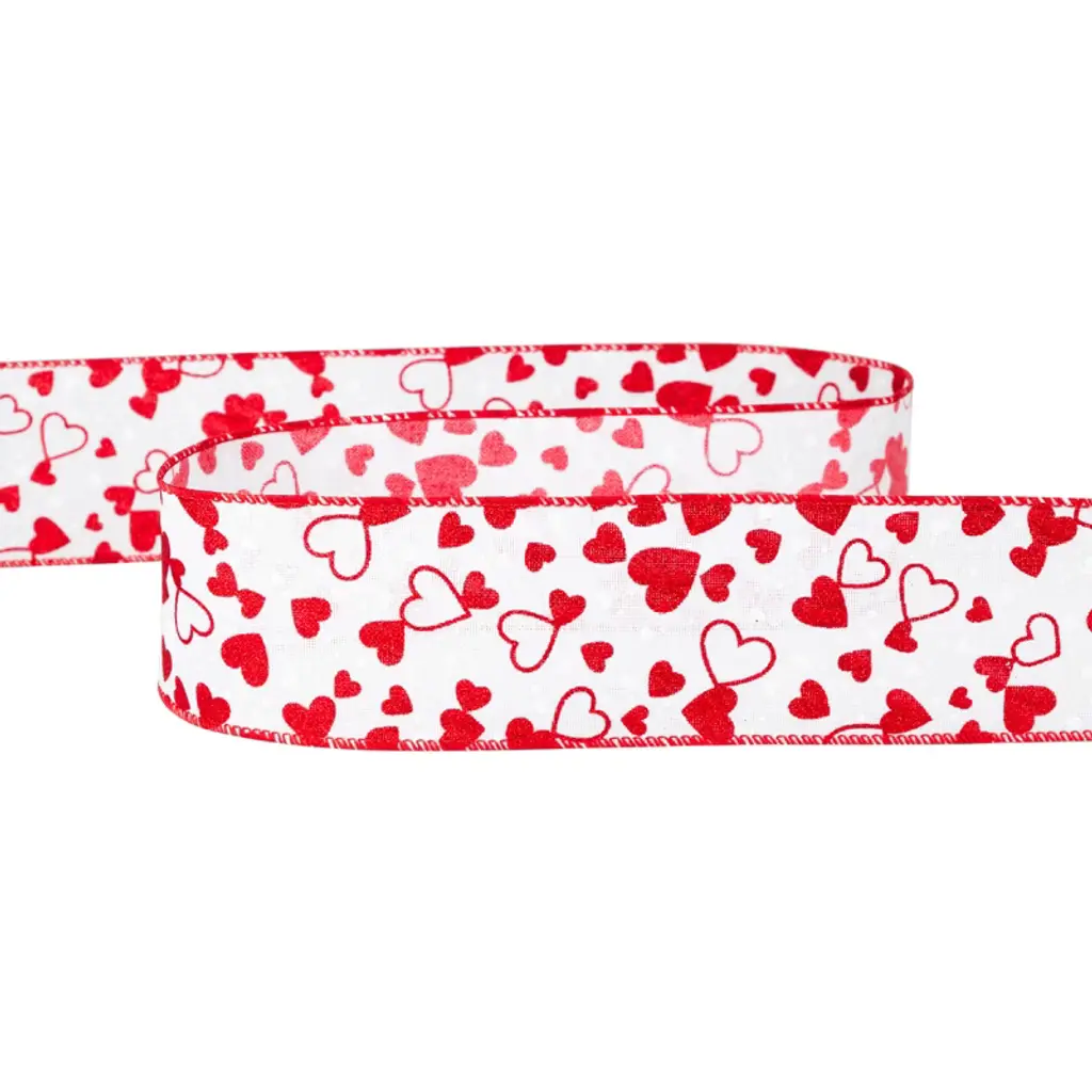 This gorgeous ribbon would be a great way to decorate your gifts and home for the holiday season. This wired ribbon will help everyday designs maintain their shape and beauty. Whether you're a florist an event planner or crafter, wired edge ribbon is a dream to work with. Add this ribbon to gifts, wreaths or trees to add sparkle and beauty to your home for the holiday. Product Features: White and red glitter heart Valentine's day crafting ribbon White fabric with red and white hearts Red glitter accents some of the hearts Sewn wire edged ribbon allows you to bend and shape your creations to decorate with ease Ribbon comes on (1) spool Recommended for indoor use only Dimensions: 2.5" wide x 10 yards in length Material(s): polyester/wire