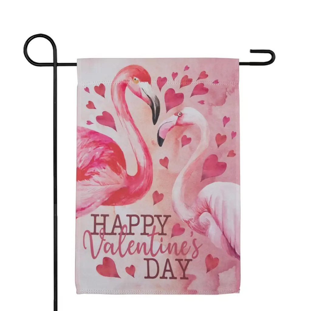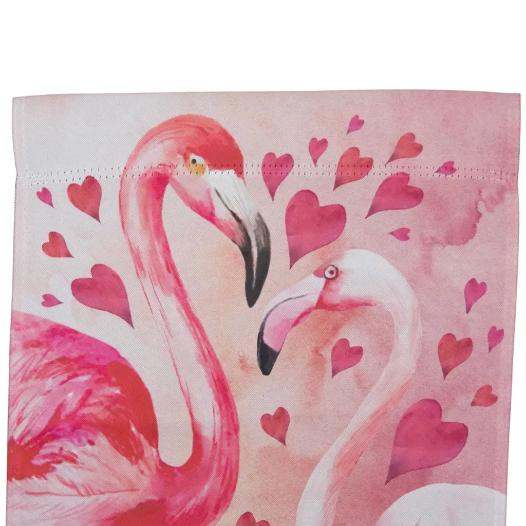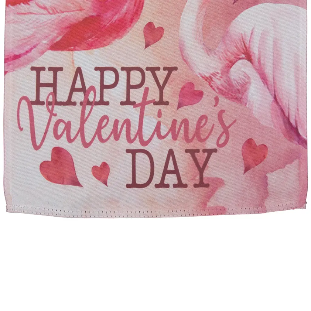 Bring the romance to your garden with this lovely flag. Decorated with an array of hearts and a couple of adoring flamingos. A perfect addition to your Valentine's Day outdoor decor! Product Features: Happy Valentine's Day outdoor flag Pink flamingos and various sized hearts A soft, high-quality fabric for durability Sleeve on top allows flag to slide onto flag pole - not included Double-sided design Dimensions: 18" high x 12.5" wide Material(s): polyester