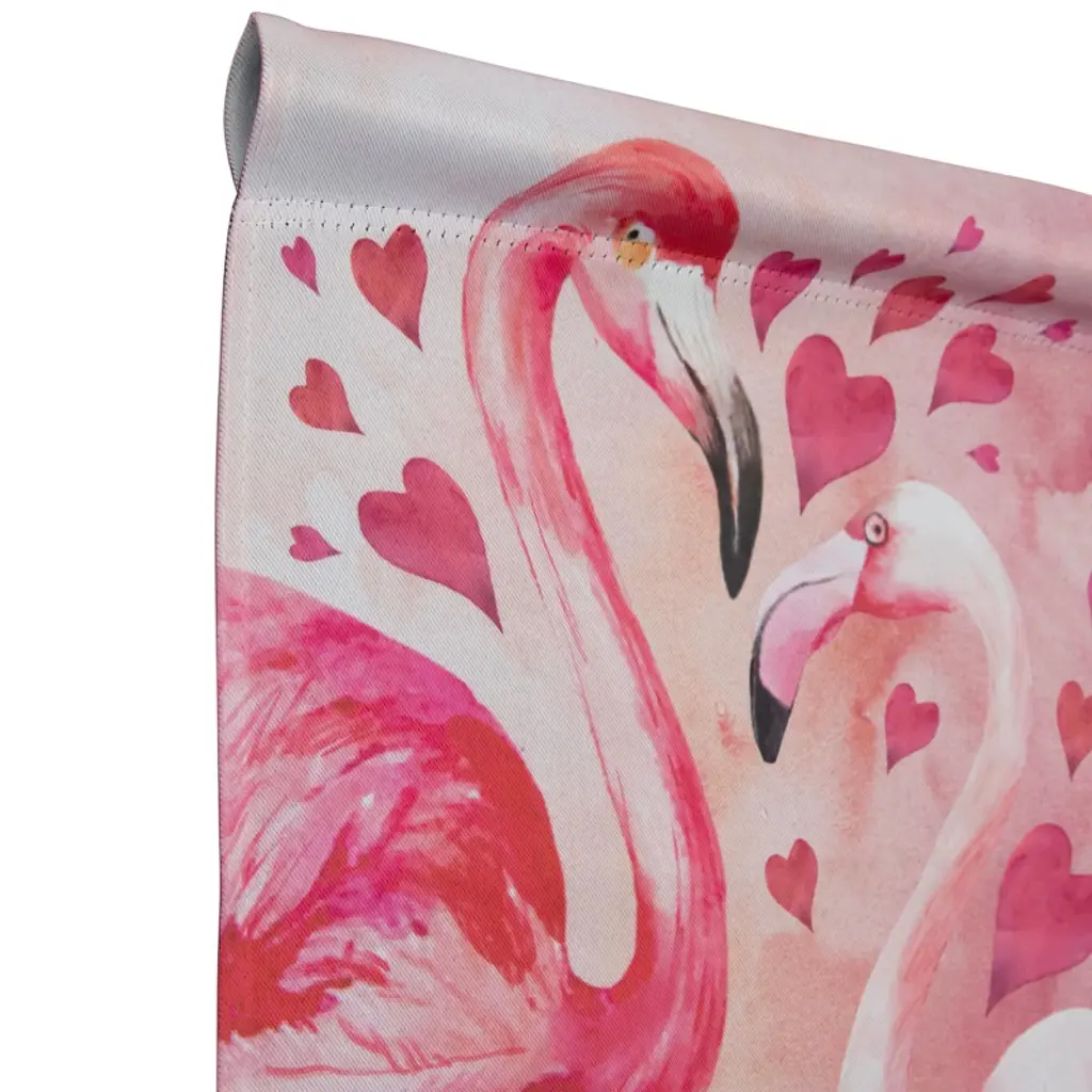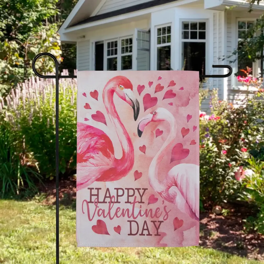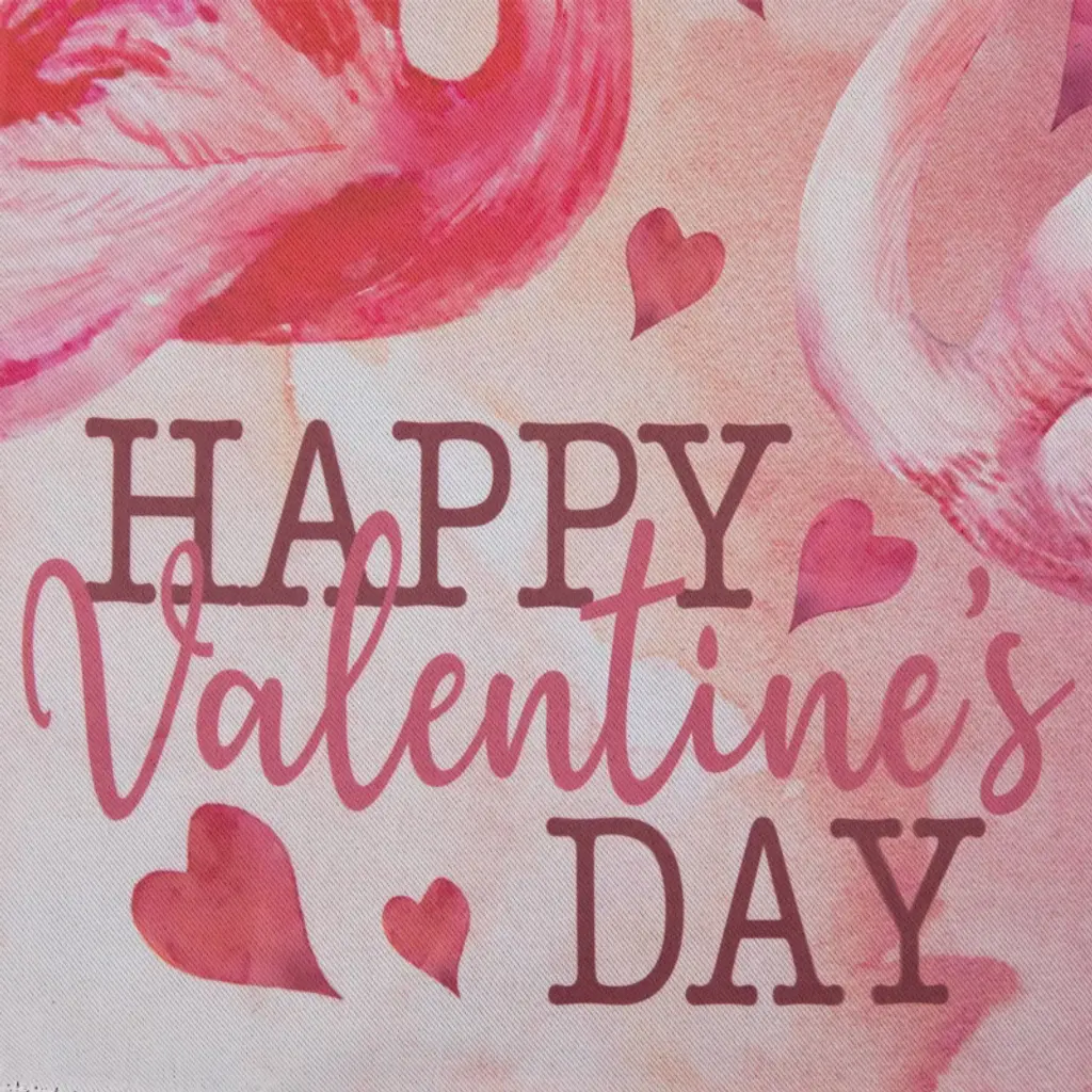 Bring the romance to your garden with this lovely flag. Decorated with an array of hearts and a couple of adoring flamingos. A perfect addition to your Valentine's Day outdoor decor! Product Features: Happy Valentine's Day outdoor flag Pink flamingos and various sized hearts A soft, high-quality fabric for durability Sleeve on top allows flag to slide onto flag pole - not included Double-sided design Dimensions: 18" high x 12.5" wide Material(s): polyester