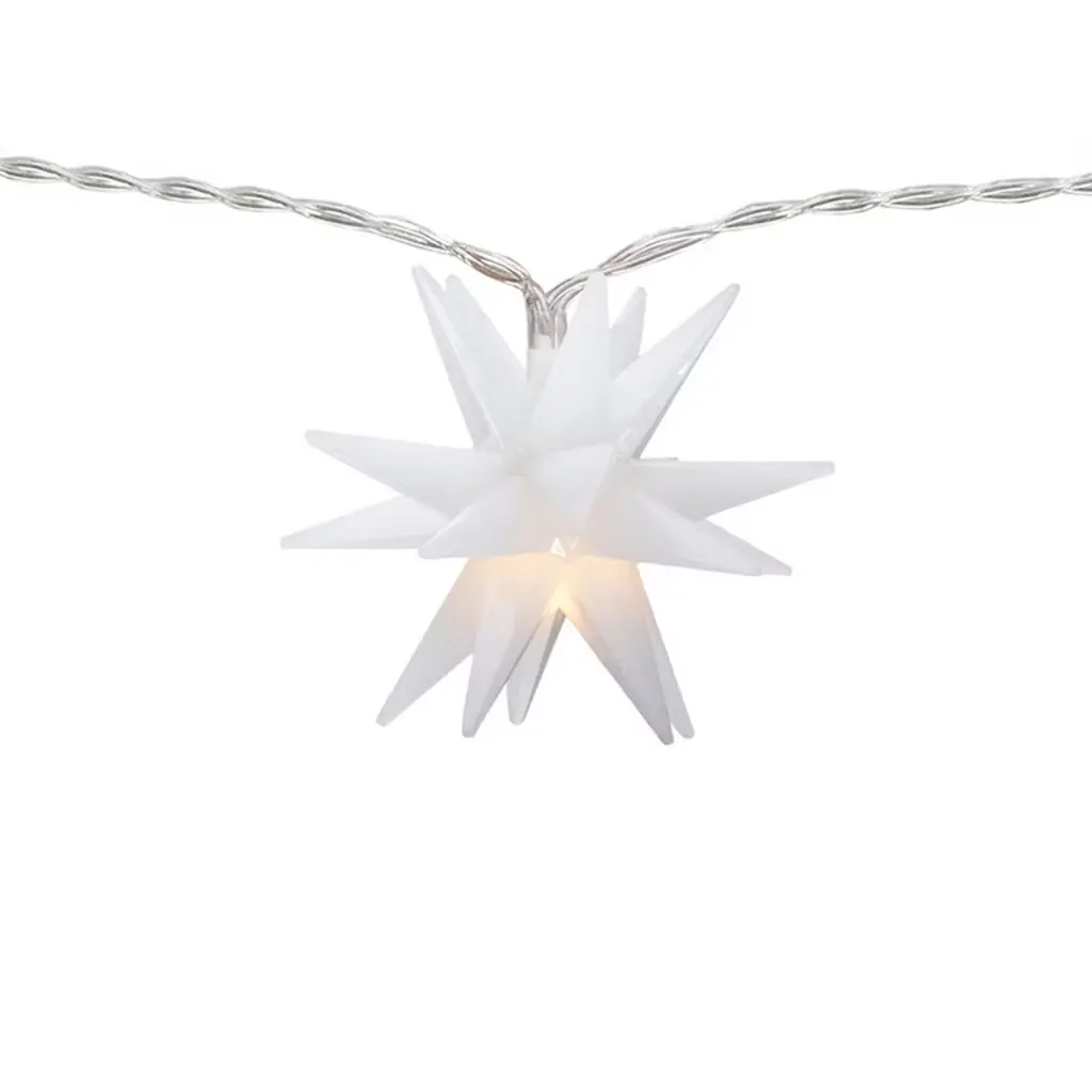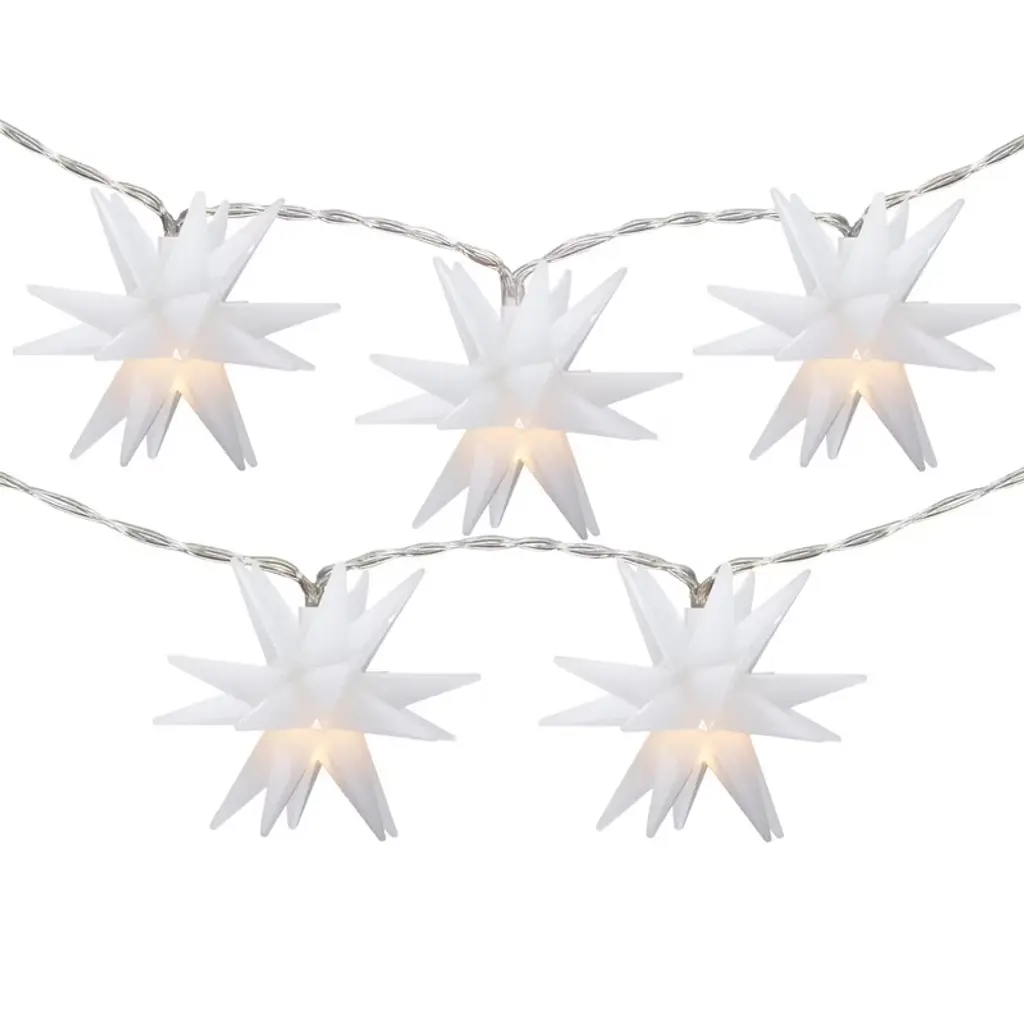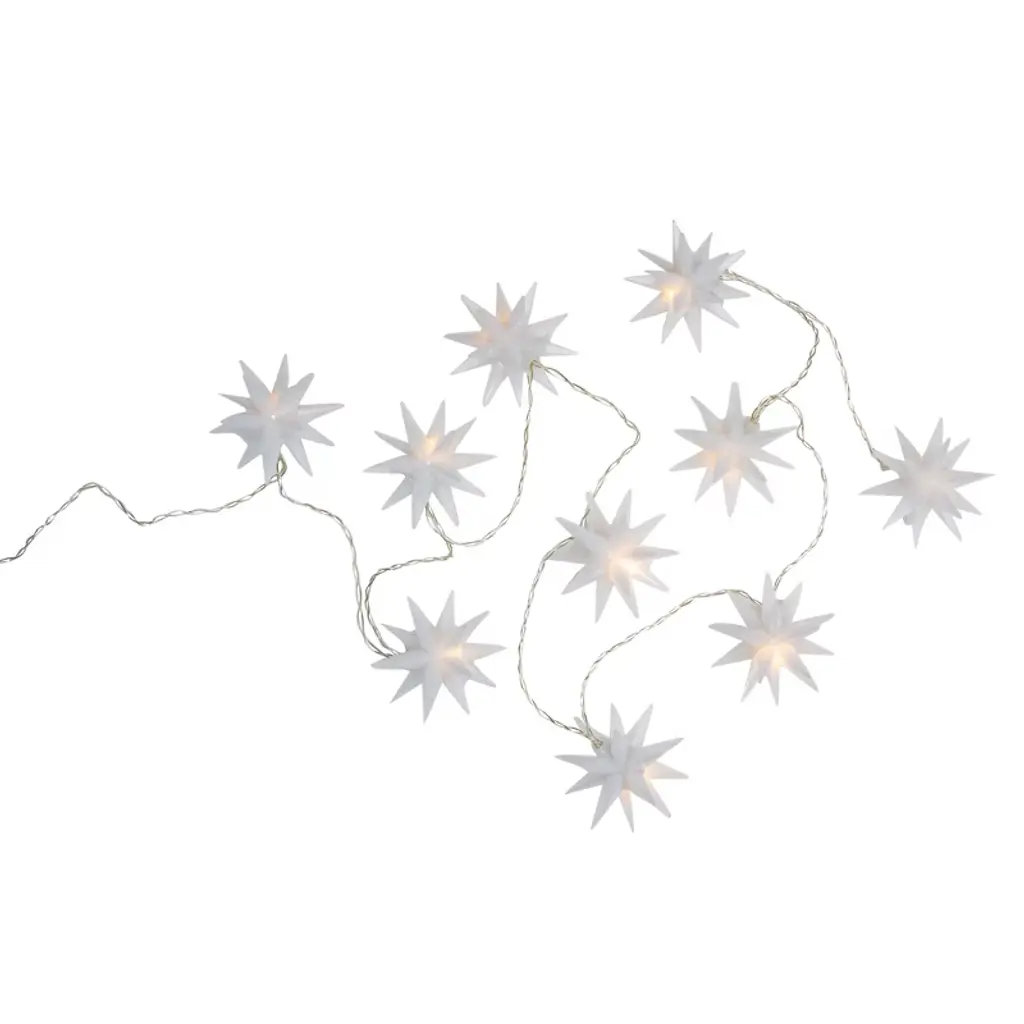 These battery-operated white star fairy lights will make your holiday decorating a breeze. Battery operated means you can place them anywhere. Durable and highly flexible, these lights can be displayed quickly and easily for all of your holiday decorating needs. Product Features: Color: warm white bulbs / silver copper wire All white, fully-dimensional stars Number of bulbs on string: 10 Bulb size: micro fairy Spacing between each bulb: 6" Lighted length: 4.5' Total length: 5.25' 11" lead cord Additional Product Features: LED lights 90% less energy Bulb stay cool to the touch UL certified and approved for indoor use only Requires 2 'AA' batteries - not included Convenient on/off switch on battery pack Non-replaceable bulbs Cannot connect multiple sets together Material(s): plastic/wire