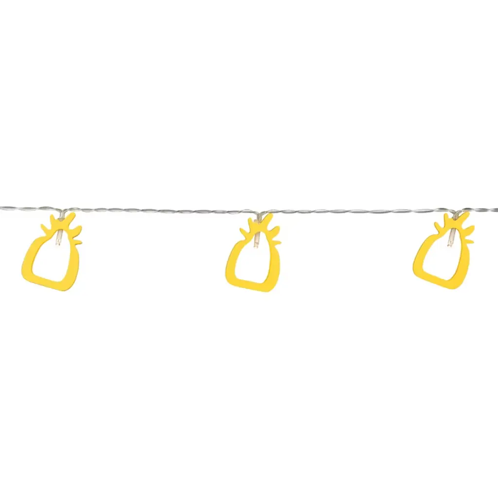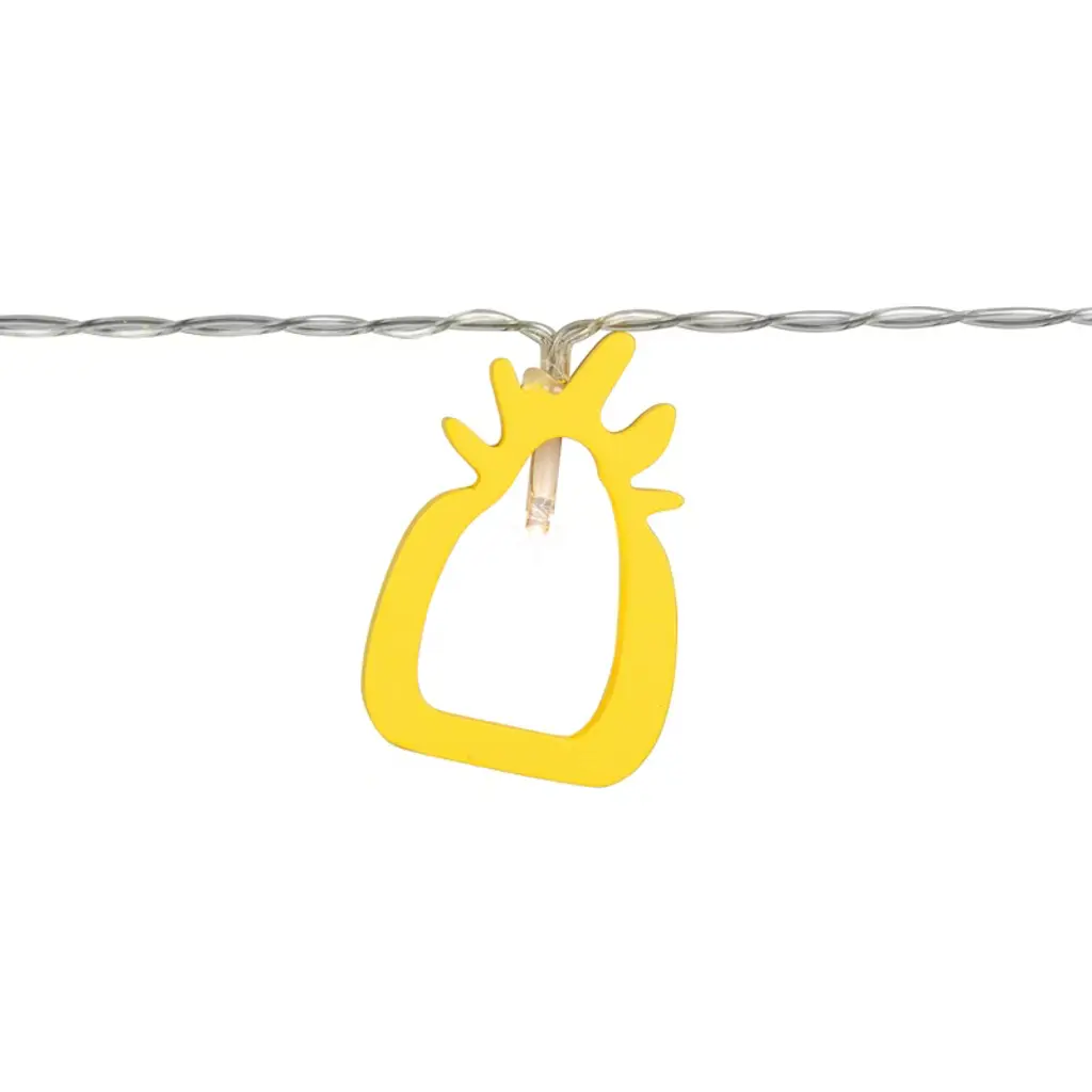 Light up your space with these adorable yellow pineapple-shaped lights. These battery-powered lights require 2 double A batteries which allow hanging from more places. Perfect for adding some holiday magic to your wreaths, trees, garland, or add to your lanterns and vases for some unique sparkle. Product Features: Color: clear bulbs / clear wire Number of bulbs on string: 10 Requires 2 AA batteries - not included Bulb size: micro Spacing between each bulb: 6" Lighted length: 4' Total length: 5' 12" lead cord Material(s): plastic/wire