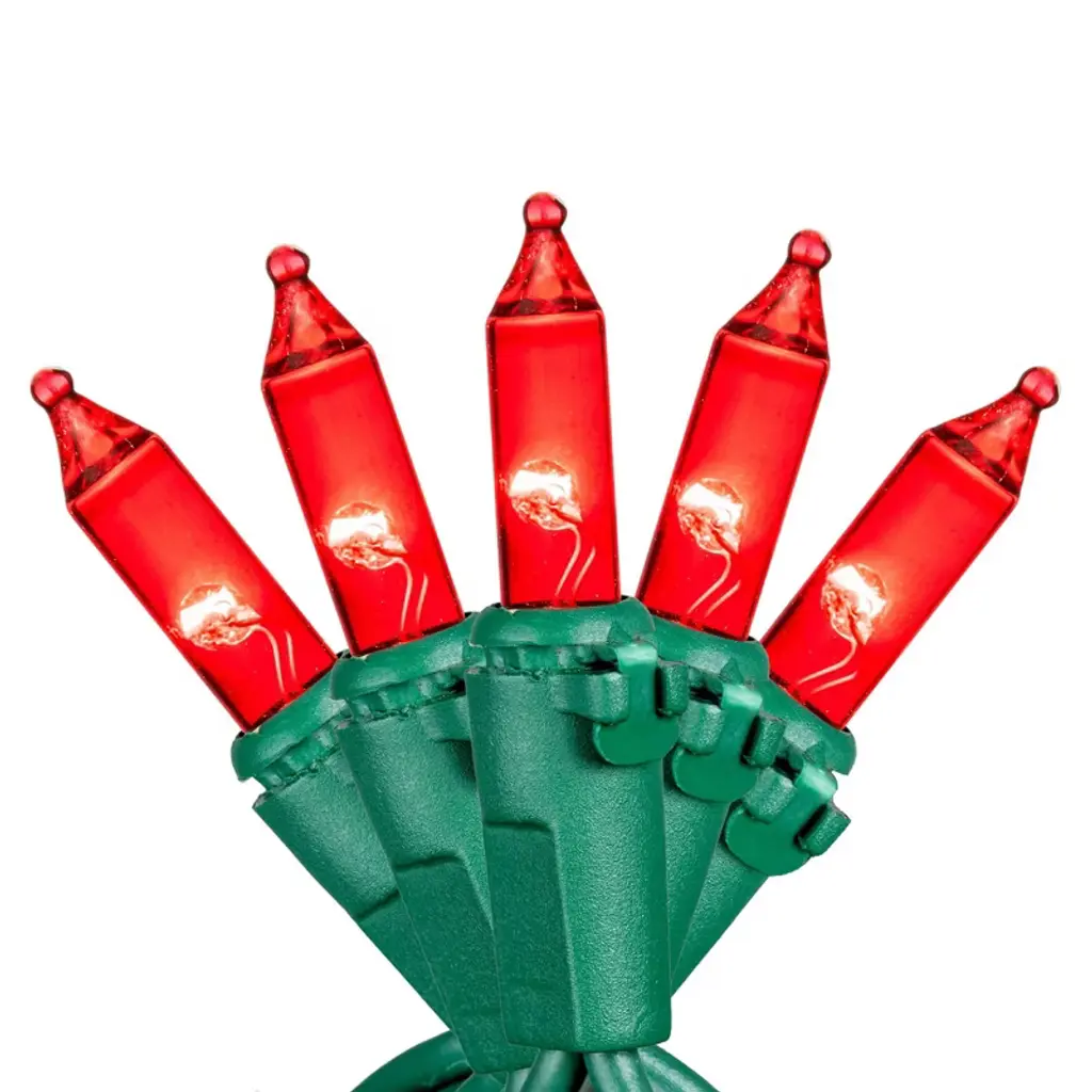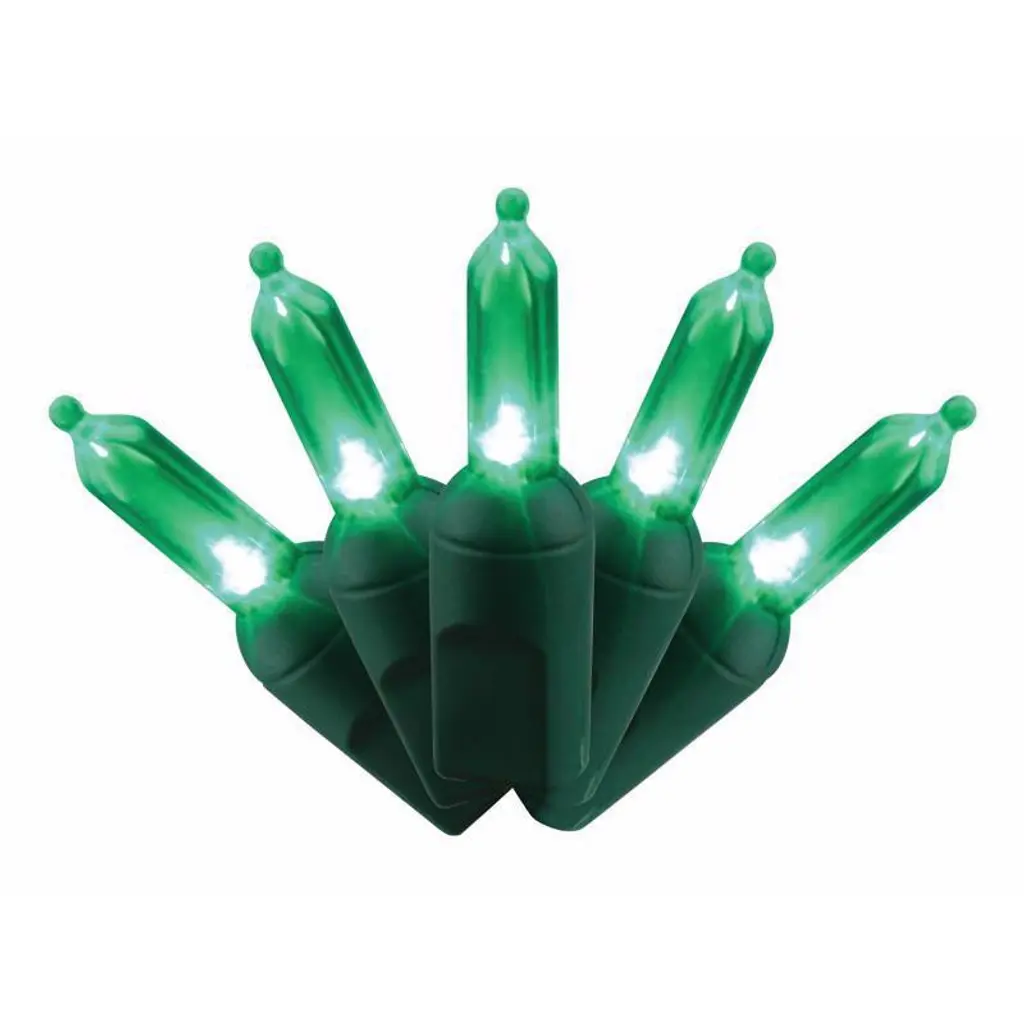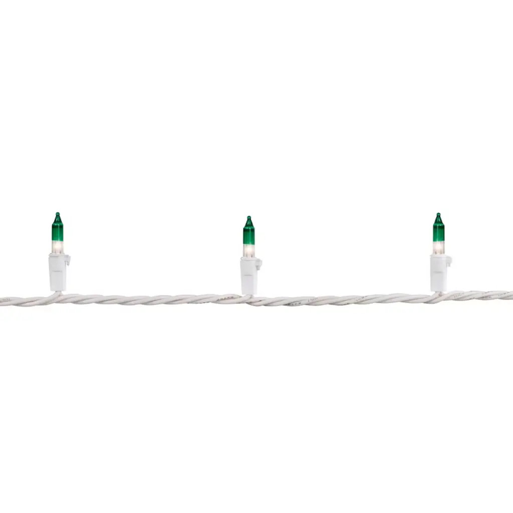 Brighten up your celebrations with this 50-count mini holiday light set featuring clear bulbs with green tips. Ideal for adding a festive glow to your holiday tree, these lights also make a charming addition to your St. Patrick's Day decor. Versatile and vibrant, they're perfect for any occasion that calls for a touch of sparkle. Product Features: Color: clear bulbs with green tips / white wire Number of bulbs on string: 50 Bulb size: mini Bulb type: incandescent Spacing between each bulb: 2.5" Lighted length: 10' Total length: 11.25' 12" lead cord 3" tail cord Additional Product Features: UL certified and approved for indoor or outdoor use If one bulb burns out, the rest will stay lit Lights are equipped with Lamp Lock feature, which makes them replaceable, interchangeable and keeps them from falling out Comes with replacement bulbs, flasher bulbs and spare fuses Contains end-to-end connectors which allow you to connect multiple sets together (not to exceed 210 watts) Wire gauge: 22 120 volts, 60 hertz, .17 amps, 20.4 watts