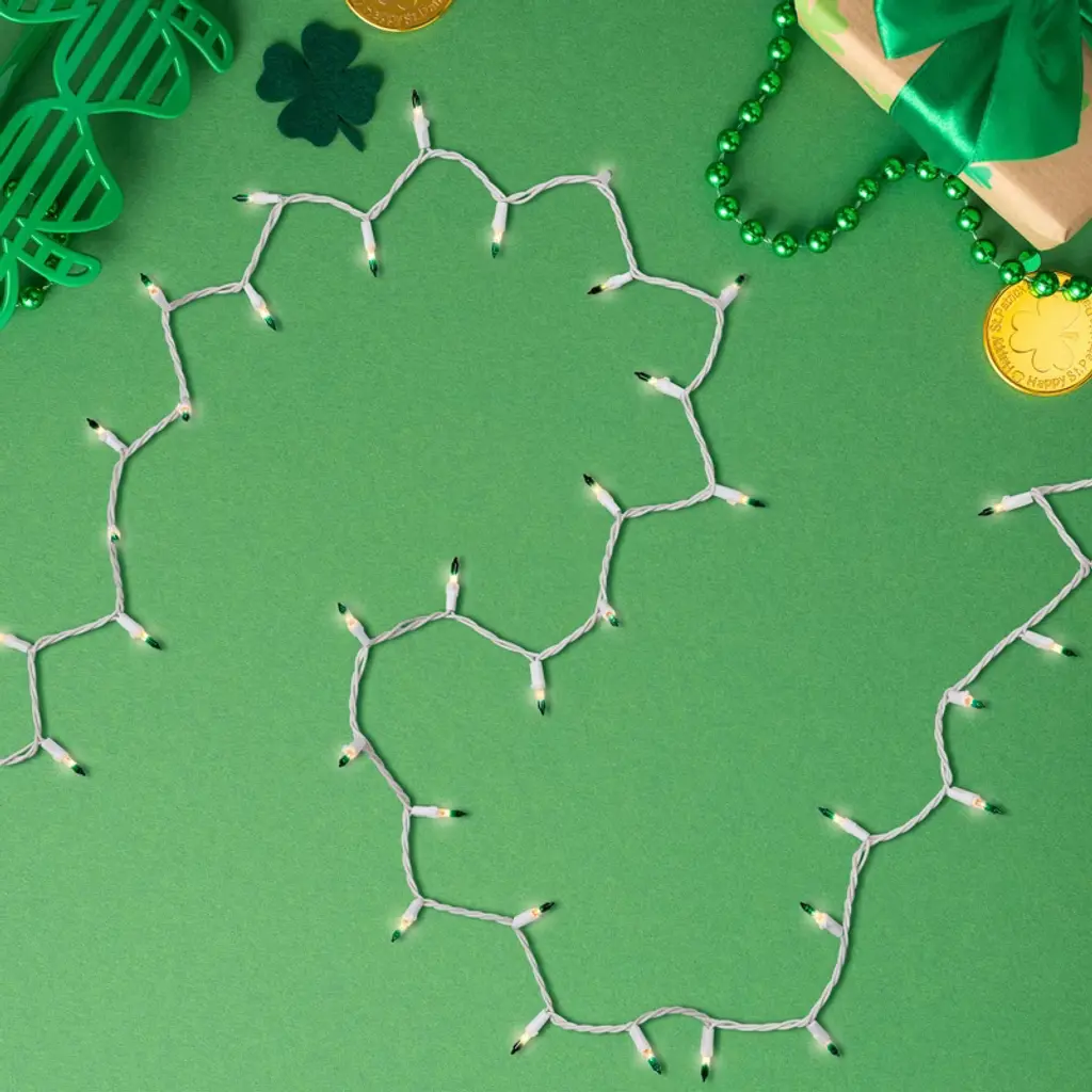 Brighten up your space with this versatile 100-count mini holiday light set. Featuring clear bulbs and green tips, it's a festive choice not just for holiday but also for St. Patrick's Day. Whether you're decorating a tree, draping a mantel, or adding sparkle to your St. Patrick's Day celebration, these lights offer a warm and inviting glow that complements any occasion. Product Features: Color: clear bulbs with green tips / white wire Number of bulbs on string: 100 Bulb size: mini Bulb type: incandescent Spacing between each bulb: 2.5" Lighted length: 20.25' Total length: 21.5' 12" lead cord 3" tail cord Additional Product Features: UL certified and approved for indoor or outdoor use If one bulb burns out, the rest will stay lit Lights are equipped with Lamp Lock feature, which makes them replaceable, interchangeable and keeps them from falling out Comes with replacement bulbs, flasher bulbs and spare fuses Contains end-to-end connectors which allow you to connect multiple sets together (not to exceed 210 watts) Wire gauge: 22 120 volts, 60 hertz, .34 amps, 40.8 watts