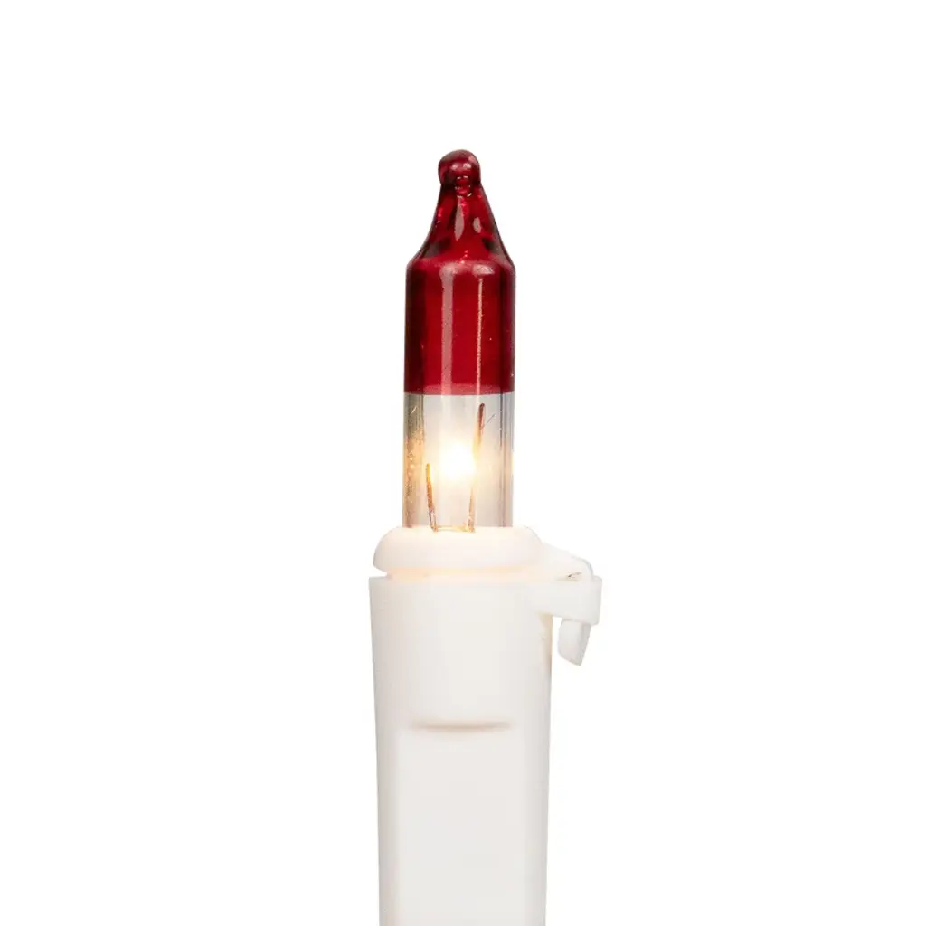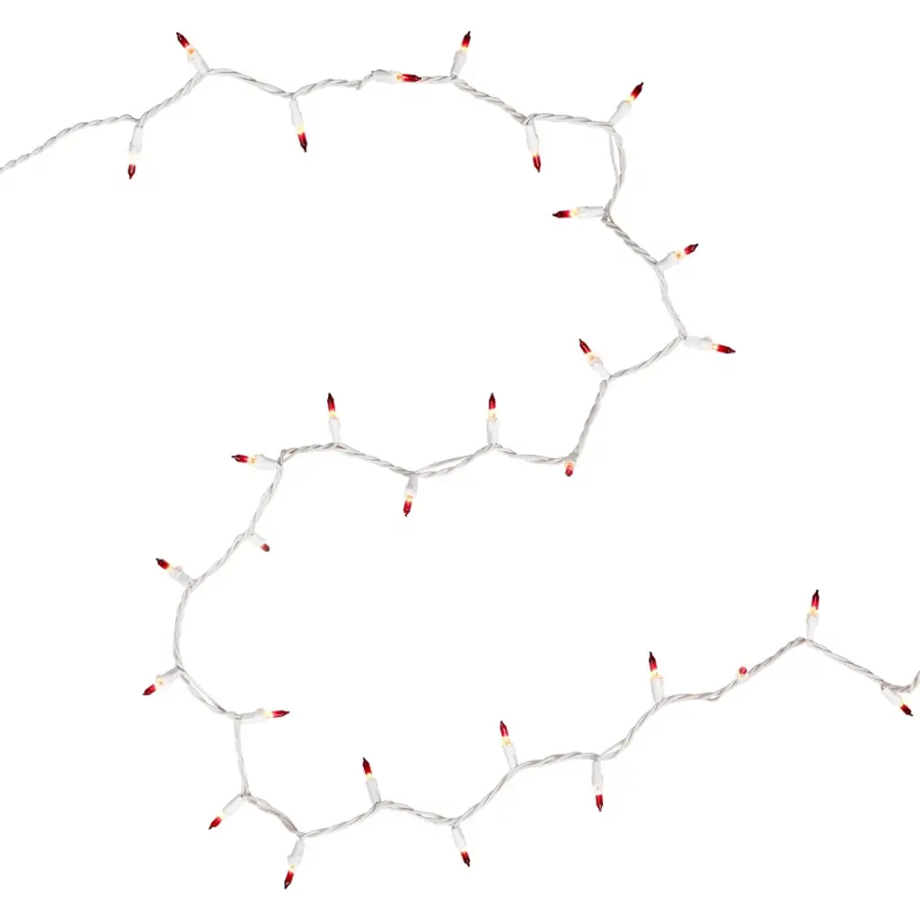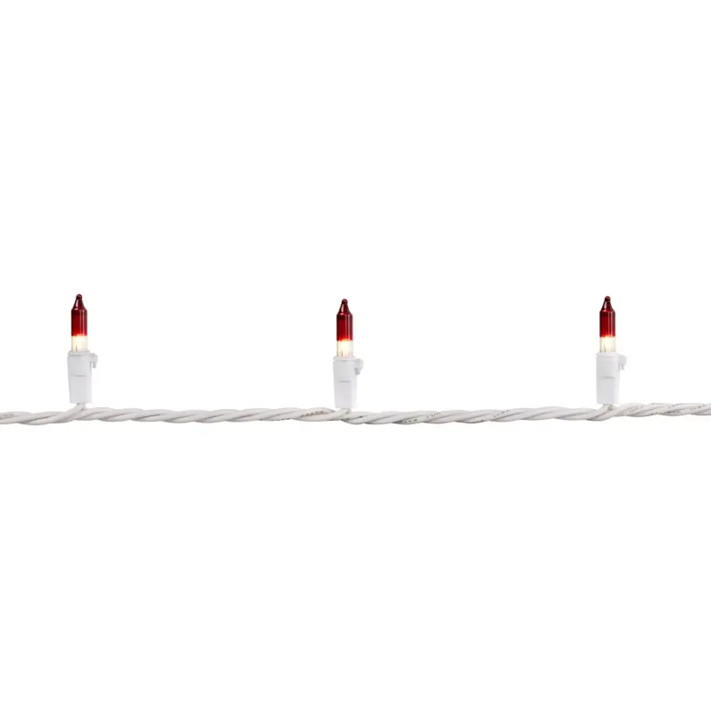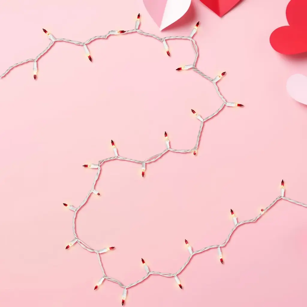 Brighten up your space with these 50-count mini holiday lights in red and clear. Perfect for creating a warm, cozy atmosphere during the holiday season, these versatile lights also add a charming touch for Valentine's Day decorations. Whether you're decking the halls or setting a romantic mood, these lights offer a delightful glow that's sure to enhance any occasion. Product Features: Color: clear bulbs with red tips / white wire Number of bulbs on string: 50 Bulb size: mini Bulb type: incandescent Spacing between each bulb: 2.5" Lighted length: 10' Total length: 11.25' 12" lead cord 3" tail cord Additional Product Features: UL certified and approved for indoor or outdoor use If one bulb burns out, the rest will stay lit Lights are equipped with Lamp Lock feature, which makes them replaceable, interchangeable and keeps them from falling out Comes with replacement bulbs, flasher bulbs and spare fuses Contains end-to-end connectors which allow you to connect multiple sets together (not to exceed 210 watts) Wire gauge: 22 120 volts, 60 hertz, .17 amps, 20.4 watts