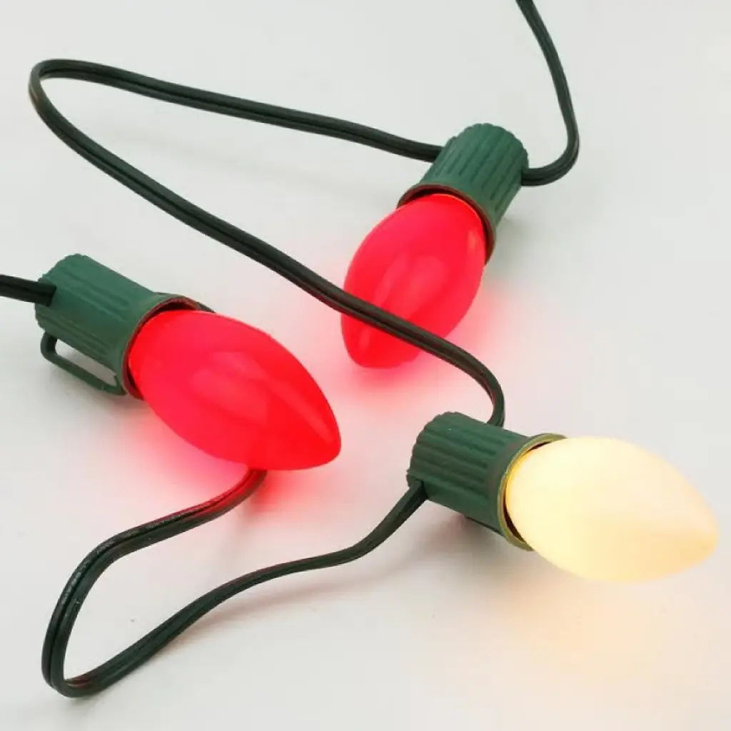 Add some spice to your holiday decor with these beautiful candy cane-inspired C7 holiday lights! This classic duo of red and white hues will bring a delightful sparkle to your holiday tree, garland, or wreath. The gentle illumination of these incandescent holiday lights adds a charming touch to any setting, and their opaque finish softly brightens your space. These versatile lights are perfect for restaurants, birthdays, outdoor gatherings, or any special event. Product Features: Color: opaque red and clear white bulbs / green wire Number of bulbs on string: 25 Bulb size: C7 Spacing between each bulb: 12" Lighted length: 24' Total length: 25' 6" lead cord 6" tail cord Additional Product Features: Each light has a clip on their base so you can easily attach the lights to your tree or other desired surfaces Fully assembled Bulbs easily screw in and out If one bulb burns out, the rest will stay lit Contains end-to-end connectors which allow you to connect multiple lighted items together (not to exceed 210 watts) UL certified and approved for indoor or outdoor use Wire gauge: 20 120 volts, 60 hertz, 1.04 amps, 125 watts Material(s): glass/plastic/wire