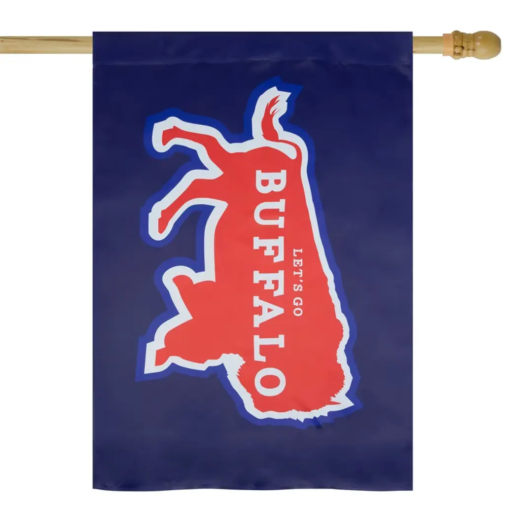 Show your hometown pride and make a statement with this Lets Go Buffalo flag. This navy flag features a red buffalo outlined in white. Let's Go Buffalo is printed on the buffalo in white print. Makes a great addition to your home or as a gift for your friends or family. Product Features: Buffalo garden flag Vibrant colors of red, navy and white Soft, durable fabric Sleeve on top allows the flag to slide onto flag pole - not included Dimensions: 40" high x 28" wide Material(s): nylon/polyester