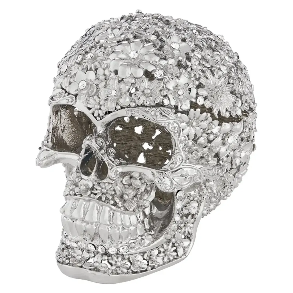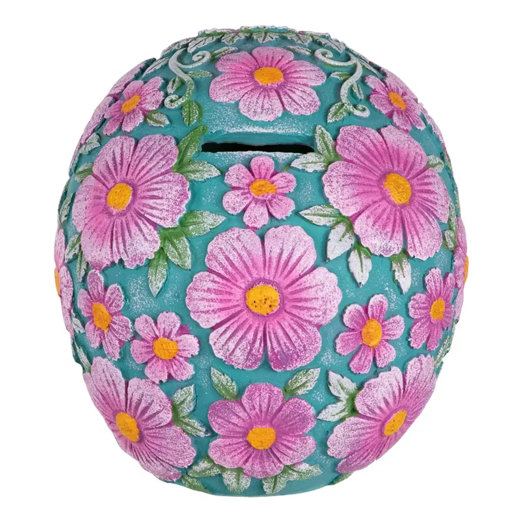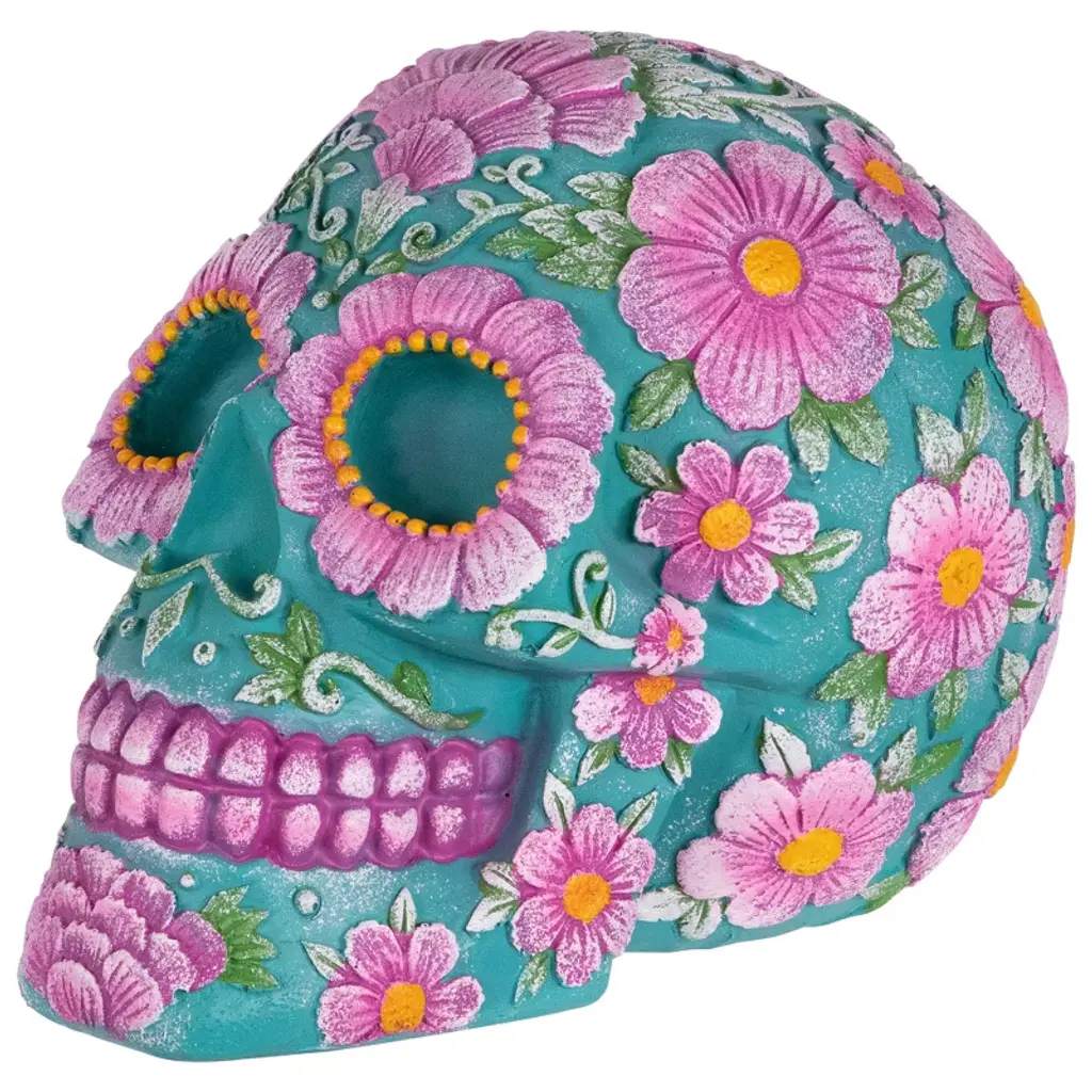 Celebrate the spooky season with a vibrant twist while saving your pennies! This coin bank is a skull with a mesmerizing turquoise blue shade, accented with captivating pink flowers. Pay homage to this rich Mexican tradition while adding a pop of color to your decor and saving your money. Embrace the spirit of Halloween all year long on your way to financial freedom. Product Features: Turquoise blue skull coin bank Designed with pink flowers, green leaves and yellow accents Slit at the top to insert money and turn stopper on the bottom to release money Perfect to display on tabletops, desks, and mantles For indoor use only Dimensions: 6"H x 5.75"W x 7.75"D Material(s): polyresin