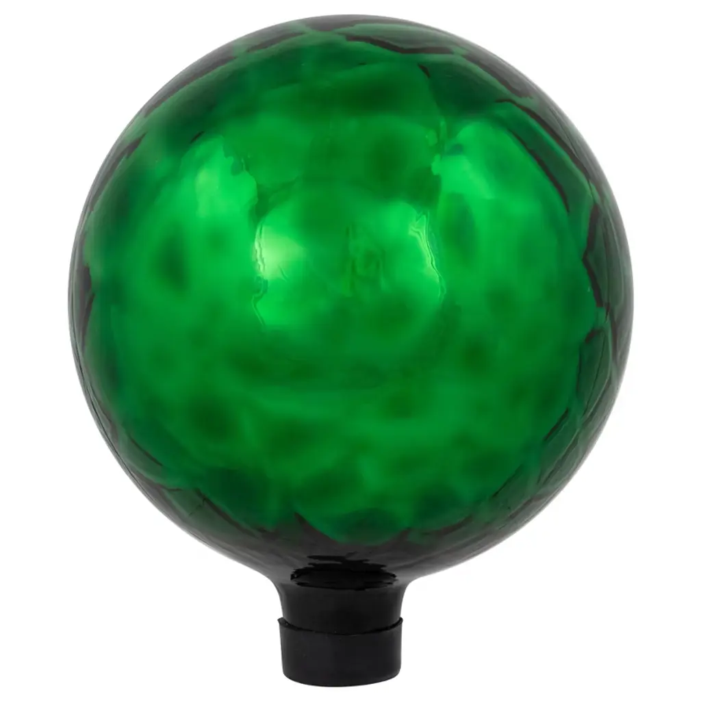 Transform your garden into a whimsical wonderland with our mesmerizing glass outdoor garden gazing ball in a captivating green hue. Inspired by the intricate patterns of a turtle shell, the enchanting, smooth design adds a touch of charm and intrigue to any outdoor space. Its unique surface features subtle variations and circular impressions reminiscent of craters on a distant planet, giving it an artful, celestial quality. Whether nestled among lush foliage or placed atop a pedestal, let this stunning gazing ball evoke a sense of magic and serenity in your garden oasis. Product Features: Smooth green garden gazing ball Rounded indentations add uniqueness Crafted with a turtle shell inspired design Can be filled with lights for an added touch of flair Stand not included For outdoor use Dimensions: 12" high x 10" diameter Material(s): glass