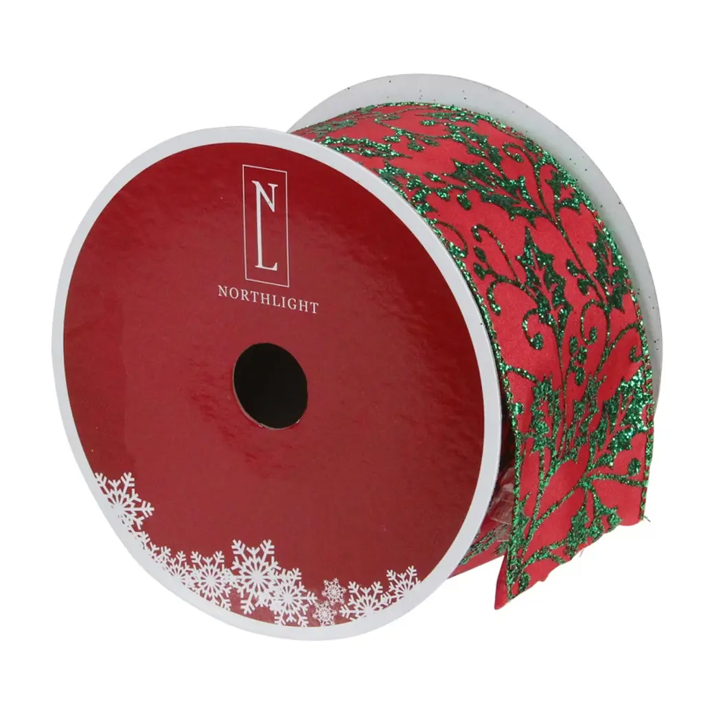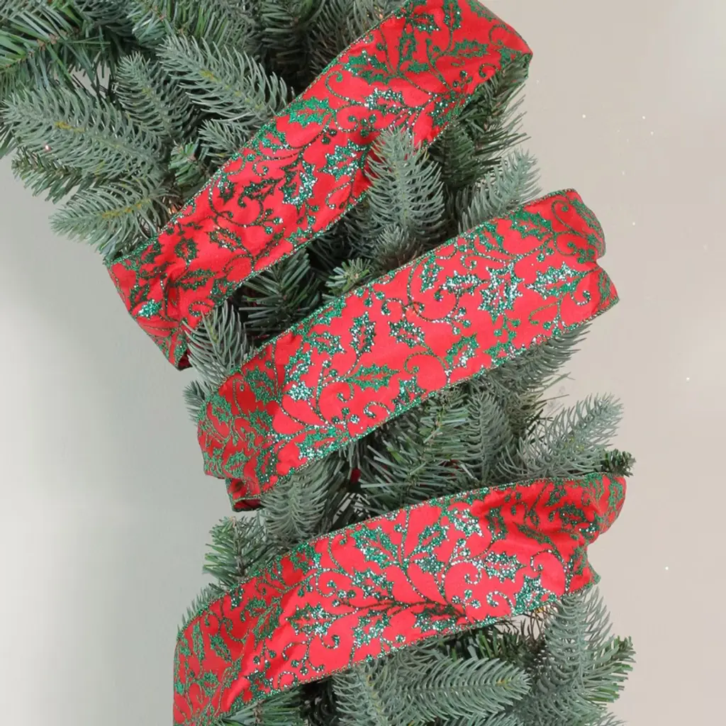 Northlight Sparkly Red And Green Holly Christmas Wired Craft Ribbon 2.5" X 16 Yards