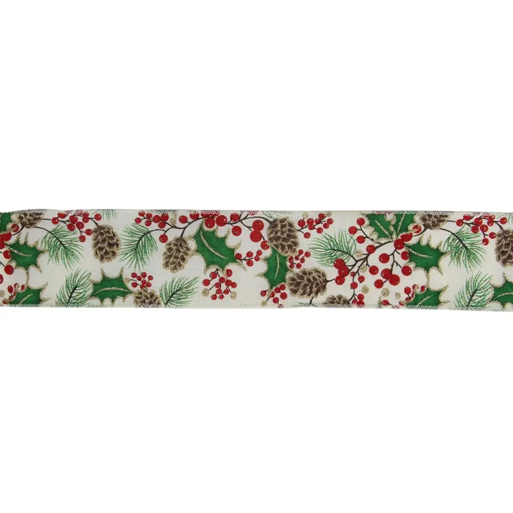 Add this festive ribbon that has shimmering green holly with a red background to your gift wrapping accessories for the holiday season. This wired ribbon will help everyday designs maintain their shape and beauty. Whether you're a florist an event planner or crafter, wired edge ribbon is a dream to work with. Add this ribbon to holiday gifts, wreaths or trees to add beauty and shine to your home for the holiday season. Product Features: holiday crafting ribbon Green sparkly holly with shiny green trim Sewn wire edged ribbon allows you to bend and shape your creations to decorate with ease Ribbon comes on (1) spool Dimensions of each spool: 2.5" wide x 16 yards in length Material(s): polyester