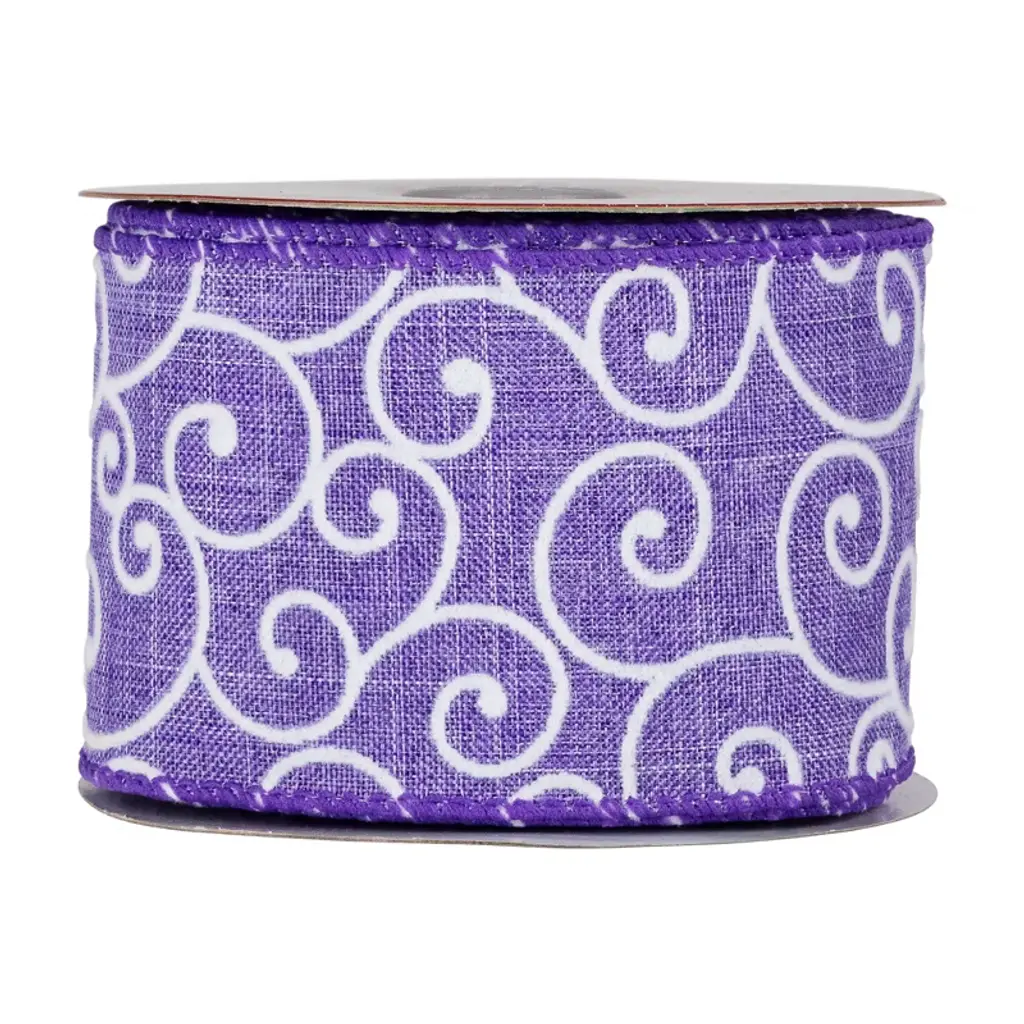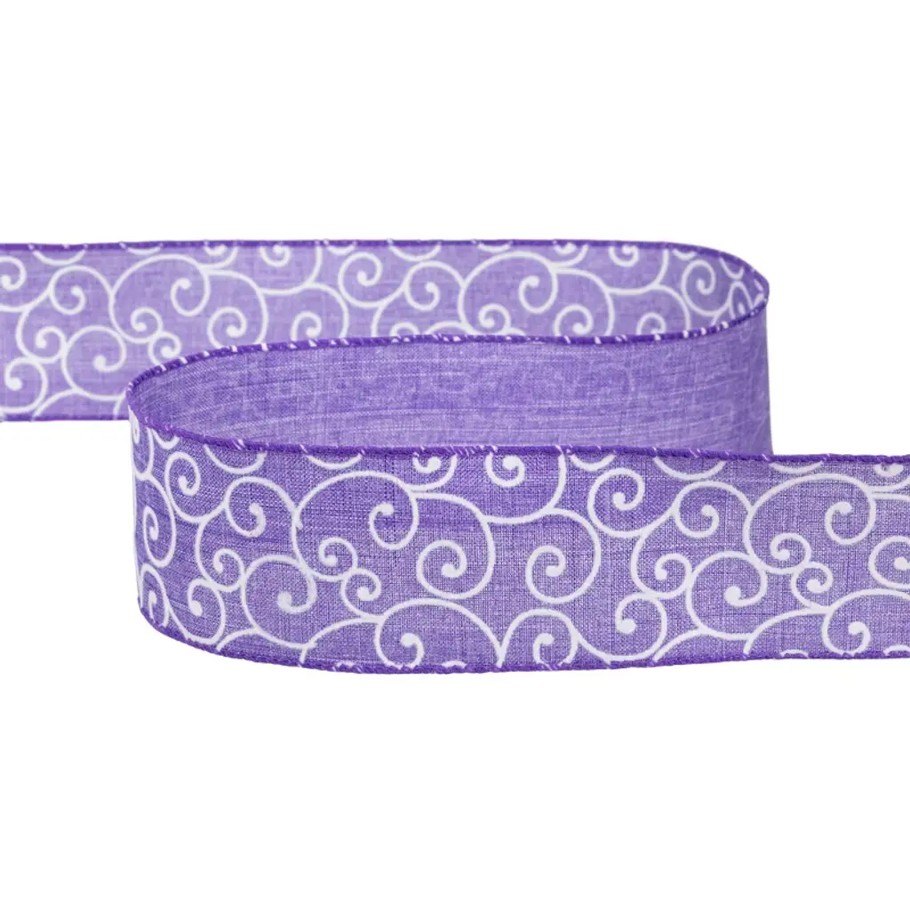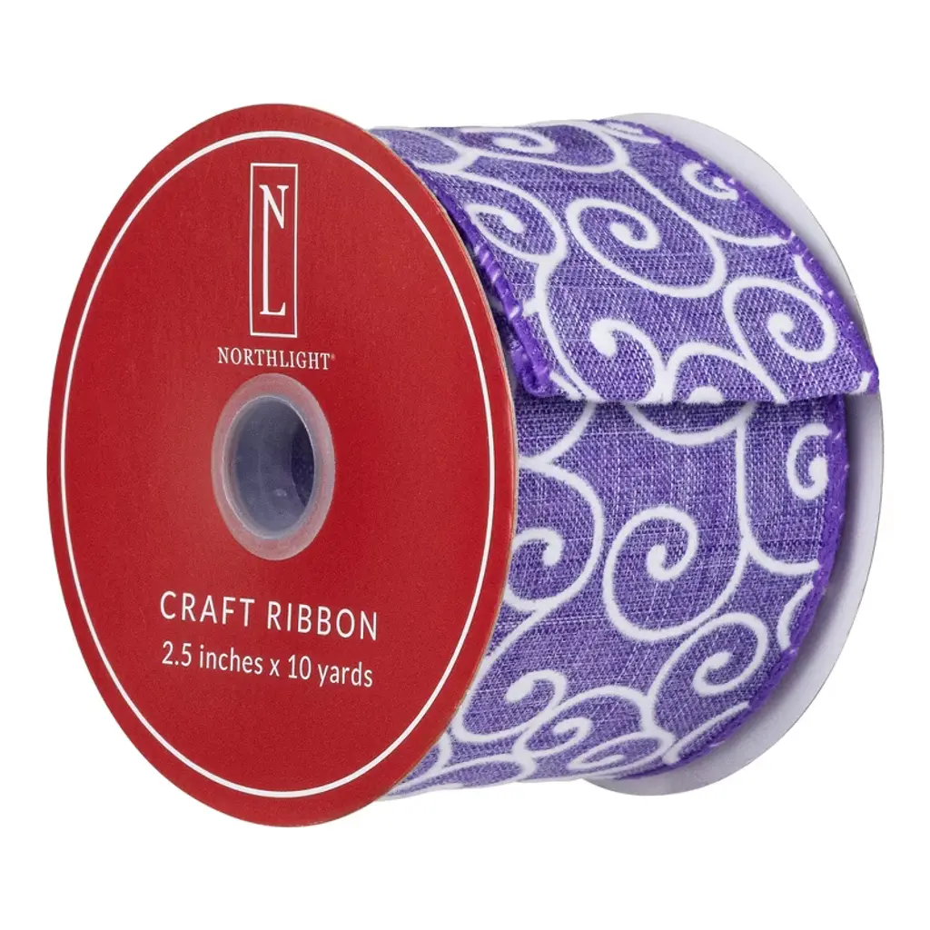 This gorgeous ribbon would be a great way to decorate your gifts and home for the spring season. This wired ribbon will help everyday designs maintain their shape and beauty. Whether you're a florist an event planner or crafter, wired edge ribbon is a dream to work with. Add this ribbon to Easter baskets gifts, wreaths, or trees to add an elegant touch to your home for the holidays. Product Features: Purple canvas base with white swirls Sewn wire edged ribbon allows you to bend and shape your creations to decorate with ease Ribbon comes on (1) spool Recommended for indoor use only Dimensions: 2.5" wide x 10 yards in length Material(s): polyester/wire