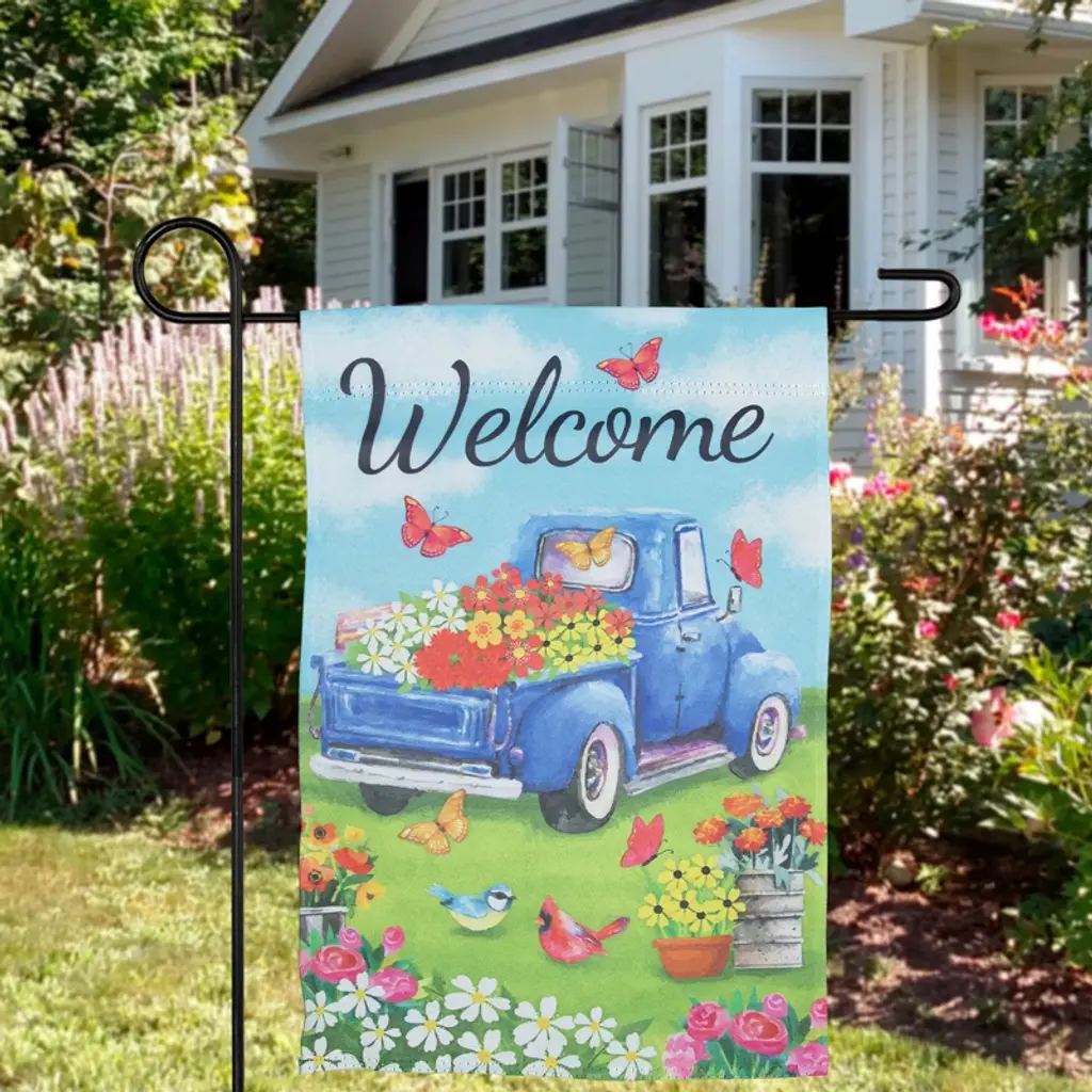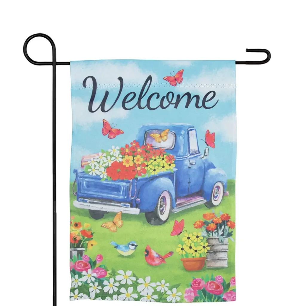 Do you love all things vintage? This beautiful garden flag is the perfect way to display your style and welcome your guests. A lovely garden scene featuring a classic blue pickup truck, filled with colorful flowers. Features: Reads "Welcome" in black cursive script Lush garden scene with butterflies, birds, and an array of flowers Classic blue pickup truck carries the flowers A soft, high-quality fabric for durability Sleeve on top allows the flag to slide onto the flagpole Double-sided design Care instructions: Handwash in cold water with mild soap. Hang dry. Use cool iron if needed Dimensions: 18" long x 12.5" wide Material(s): polyester Note: Flagpole is not included