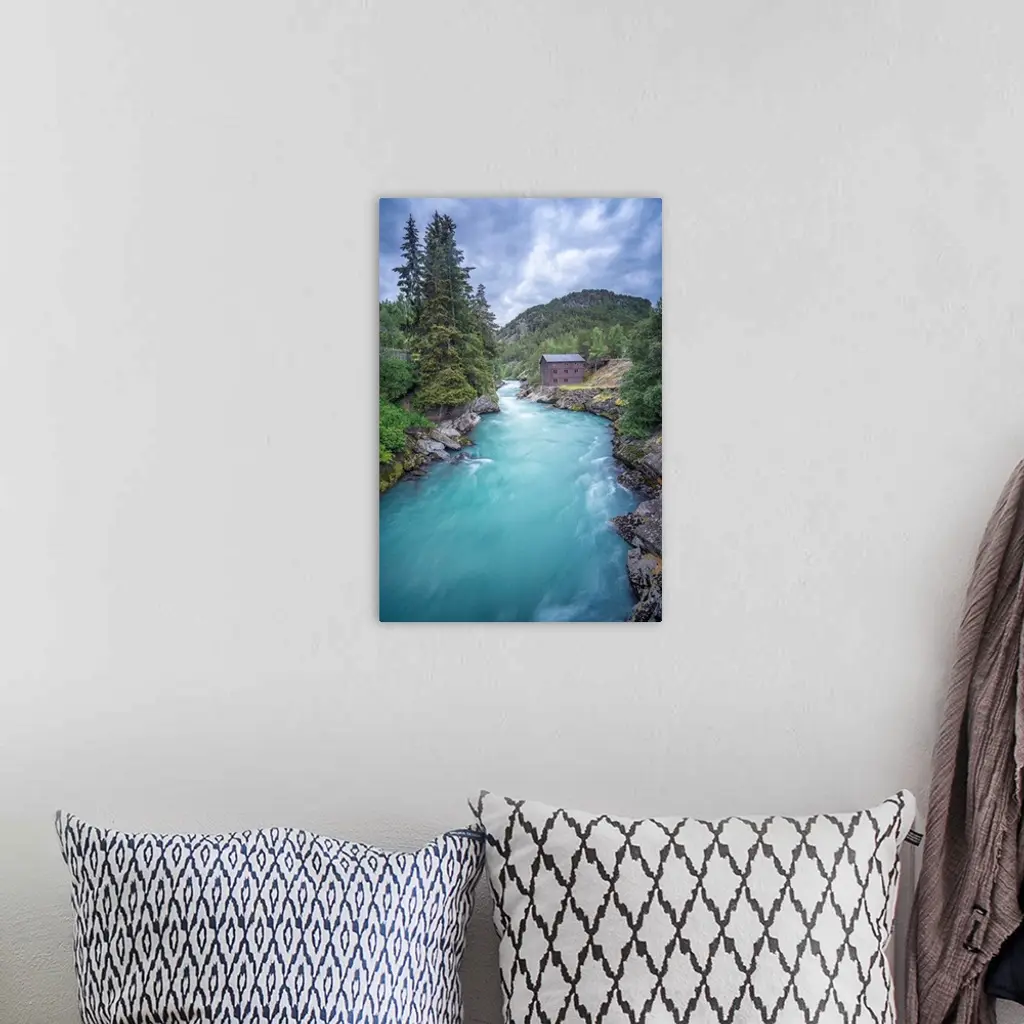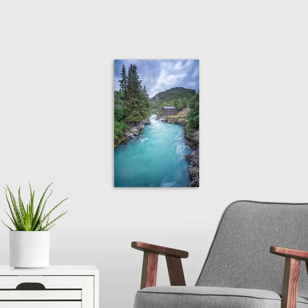 A photograph of a crystal blue river flowing through a Norwegian landscape.
