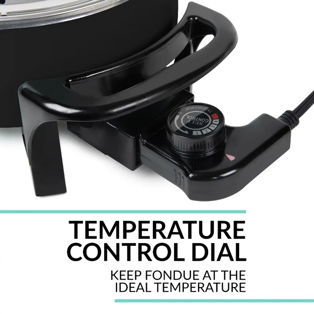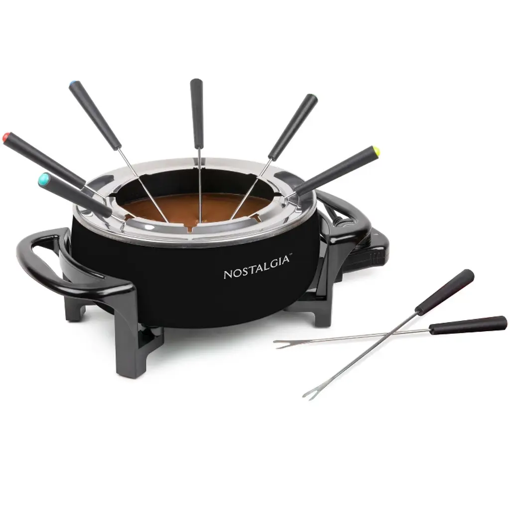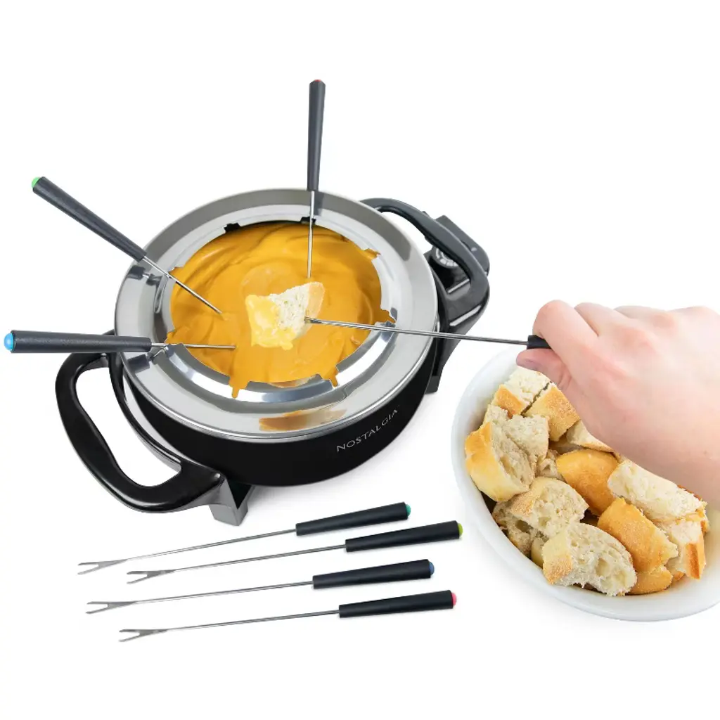 This fondue pot is a fun and stylish way to serve entrées and desserts. Make delectable cheese dips for bits of bread or try fruit dipped into chocolate to create a sweet dessert! The eight color-coded forks allows guests to serve themselves optional chocolate fondue, delectable cheese dips, ranch and more. The notches in the rim helps hold each fork in place for a better use to dip your favorite snacks.