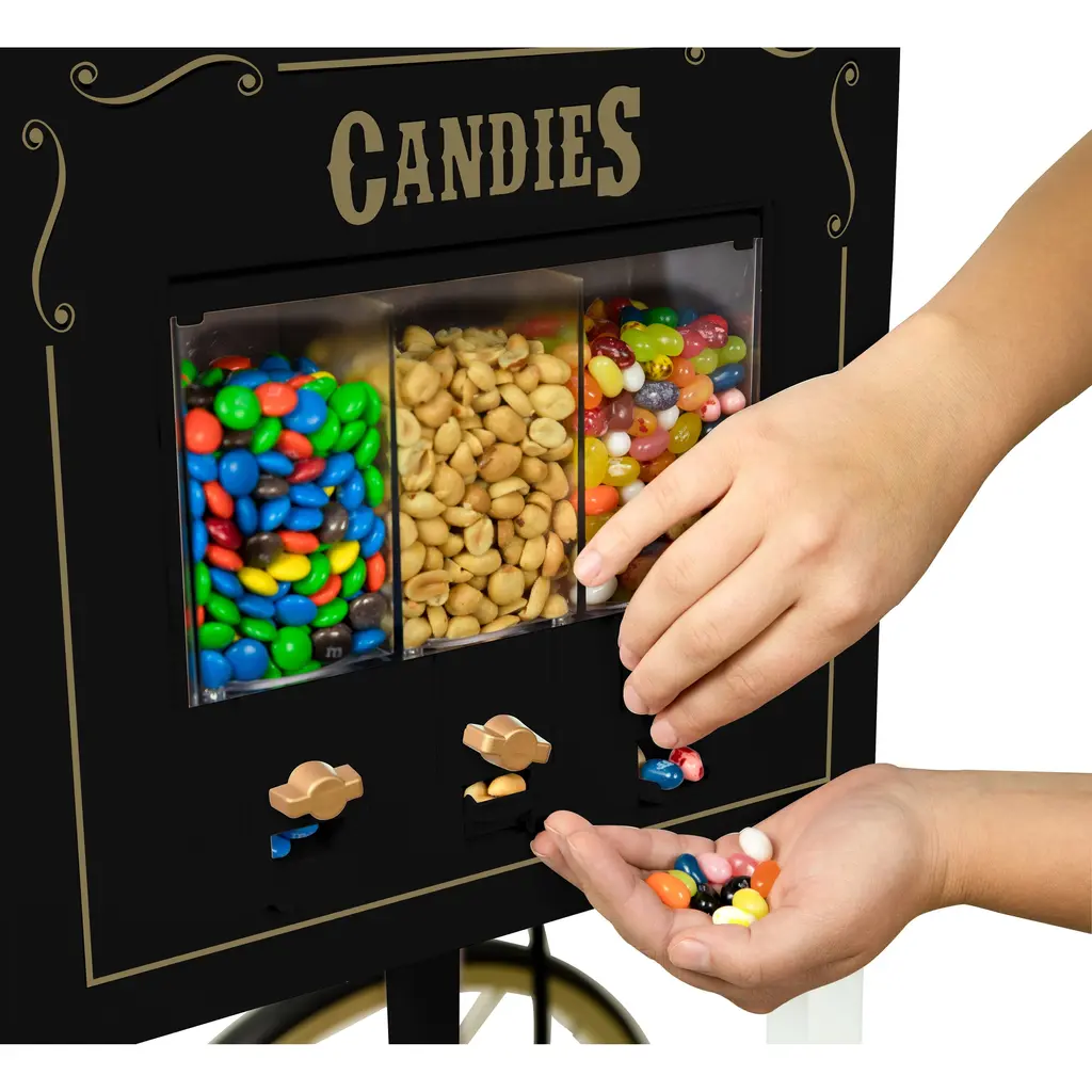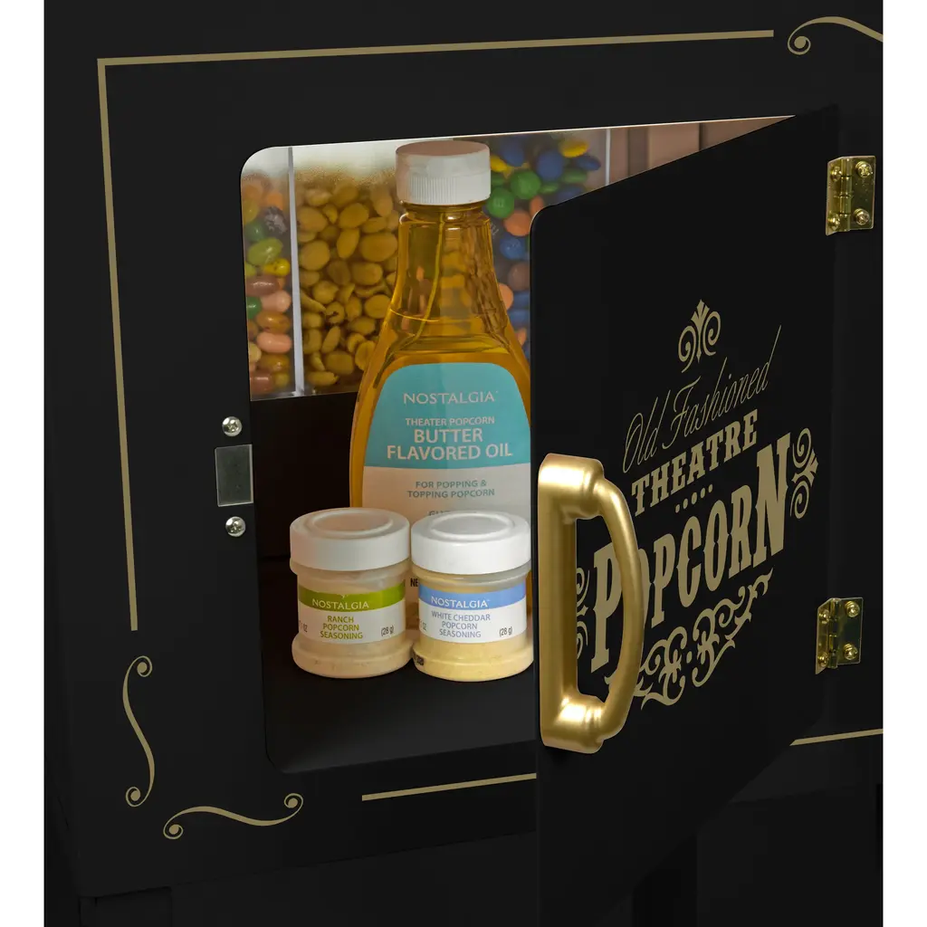 With a vintage look reminiscent of silent movie houses and carnivals of the 1900s, this cart is a classic addition to any home. Featuring a large 8-ounce kettle with built-in stirring system, this unit pops up to 32 cups of delicious popcorn every time and dispenses candy! The removable candy dispenser has three 10-oz. dispensers, allowing you to store and dispense candy, nuts, popcorn and more! Tempered glass windows and door, along with interior light, lets everyone watch each delicious kernel pop to perfection. A convenient utility shelf is perfect for popcorn preparation. Plus, keep all your popcorn essentials on hand in the convenient storage compartment. If floor space is an issue, the top removes from the base for countertop use.