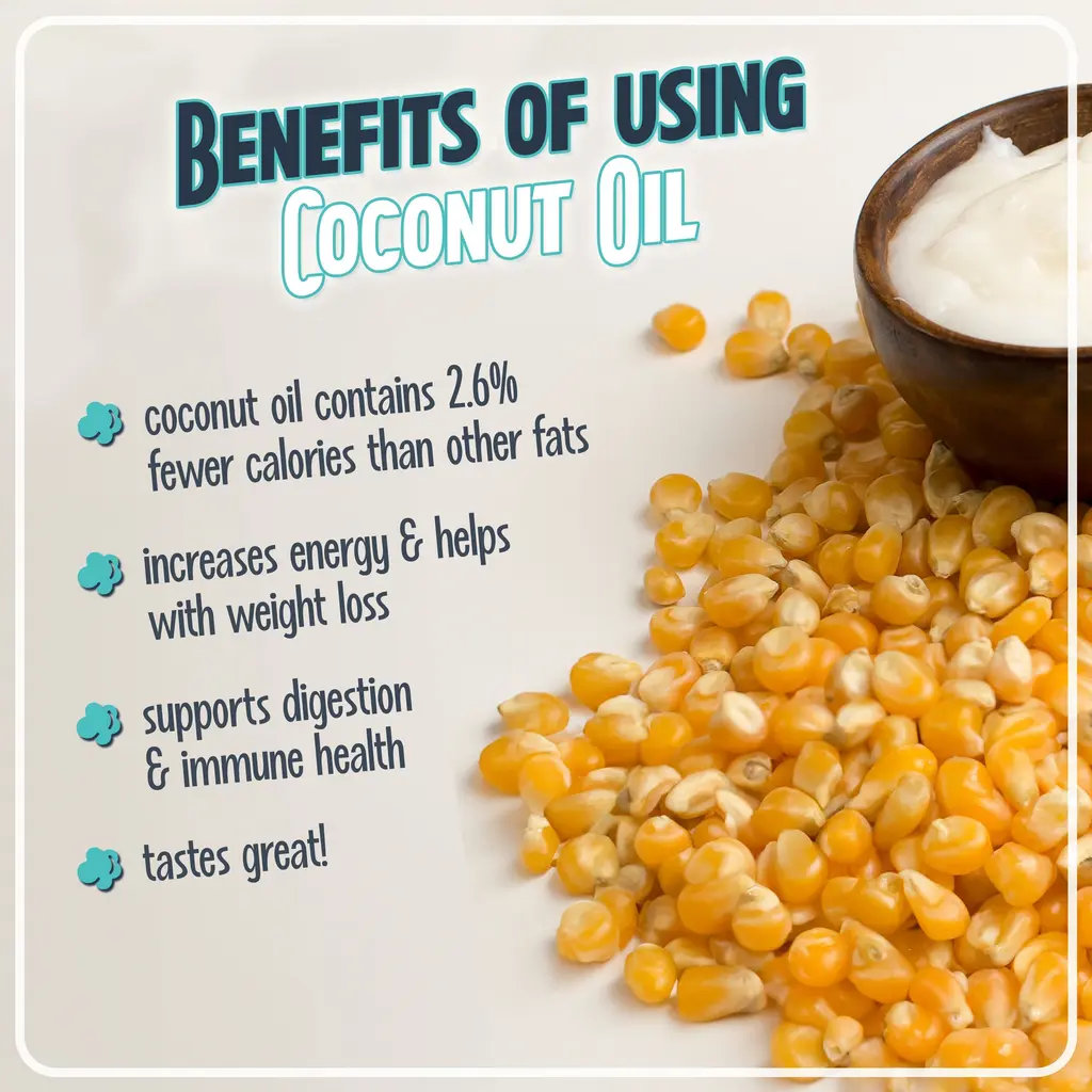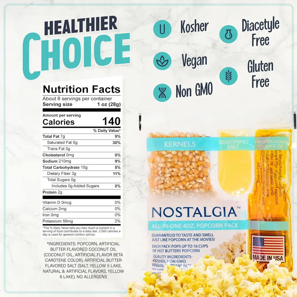 Making popcorn for movie night has never been this easy! With zero trans fat, zero saturated fat and no cholesterol, this all-in-one popcorn pack tastes fantastic while offering a healthier alternative to traditional movie theater popcorn. Each pre-portioned pouch makes up to 16 cups of popcorn per batch and can be used with any 4-ounce or larger Nostalgia kettle-style or stirring popcorn maker.
