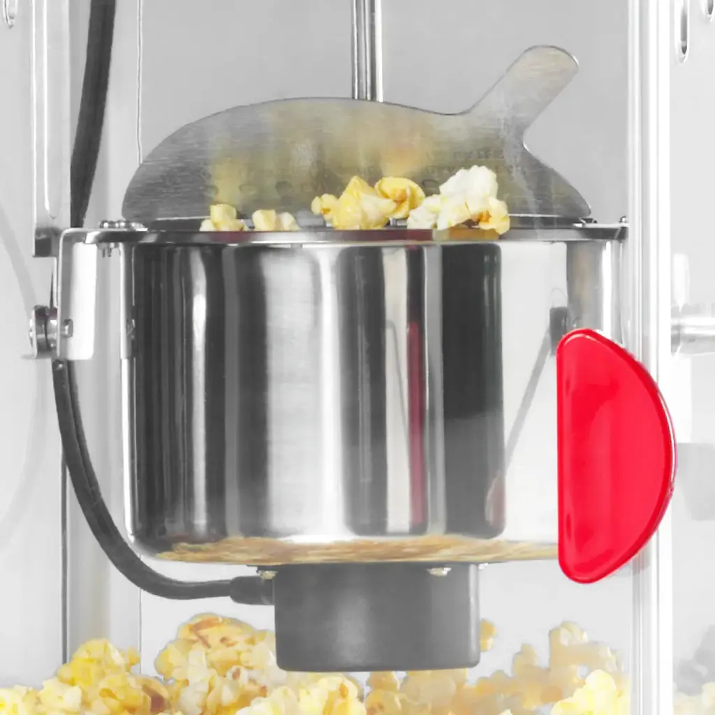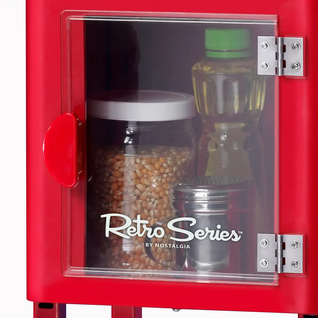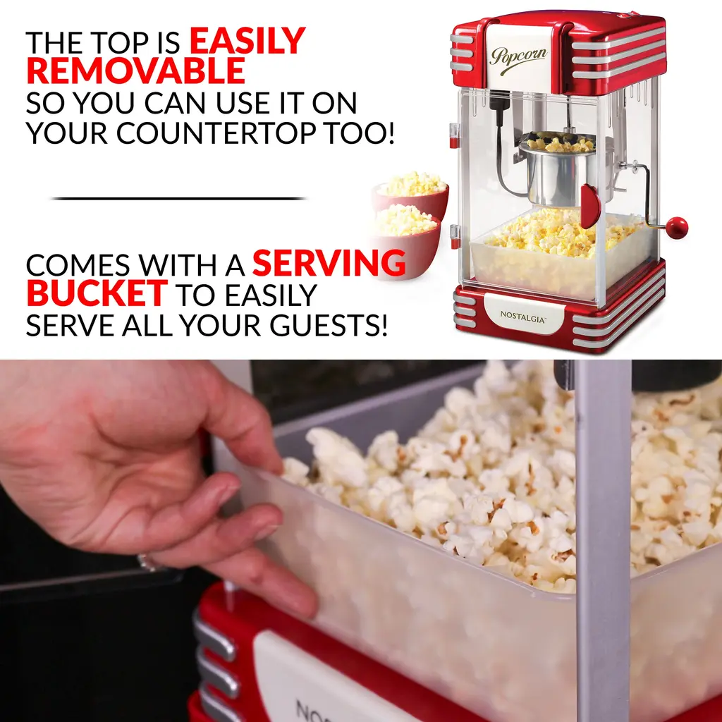 Bring the family together for movie night with this retro-styled popcorn cart! The large 2.5-ounce kettle with dual-hinged lid and built-in stirring system pops up to 10 cups of delicious crunchy popcorn. Featuring a tempered door and windows, as well as a lighted interior, this cart allows you to watch each batch pop to perfection. A tilt door allows for easy serving access and makes sharing a simple pleasure. Keep popcorn supplies in the convenient see-through storage compartment located in the base. Popcorn has never tasted so good at home! MOVIE THEATER POPCORN AT HOME: Whether it's movie night or snack time, this cart pops up to 10 cups of movie theater-style popcorn per batch to keep popcorn buckets full NOSTALGIA POPCORN KITS: Perfect for use with all Nostalgia Popcorn Kits! (Theater Hot Air & Kettle Kit-KPK400, PPB600-Reusable Popcorn Bowls, PCSP5-Pre-Measured Coconut Oil Popcorn Kit) 2.5-OZ. KETTLE: Stainless steel kettle holds 2.5-ounces of popcorn kernels and is designed with a built-in kernel stirring system and dual-hinged lid to easily empty popcorn LIGHTED INTERIOR: Lighted interior creates a fun and pleasant room ambiance and 360-degree clear view popping chamber allows you to watch your popcorn pop TILT SERVING DOOR: Outfitted with a tilt door, scooping and serving popcorn has never been easier HANDY STORAGE COMPARTMENT: Conveniently store your popcorn kernels, oils, seasonings, candy or other serving accessories in the see-through storage compartment located in the base of the unit EASY MOBILITY: 11-inch spoked wheels with convenient pull handle allows the cart to be wheeled wherever it's needed COUNTERTOP USE: The top is easily removable, allowing it to be doubled up as a countertop unit TEMPERED SAFETY GLASS: Glass windows are designed to resist breakage while being scratch and heat resistant to keep you and your family safe INCLUDED: Kernel measuring cup, oil measuring spoon are included