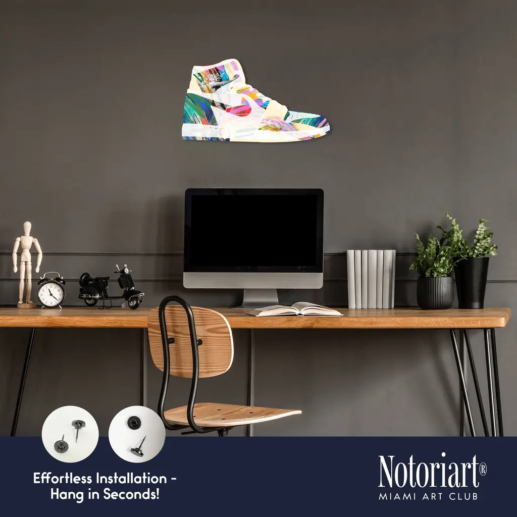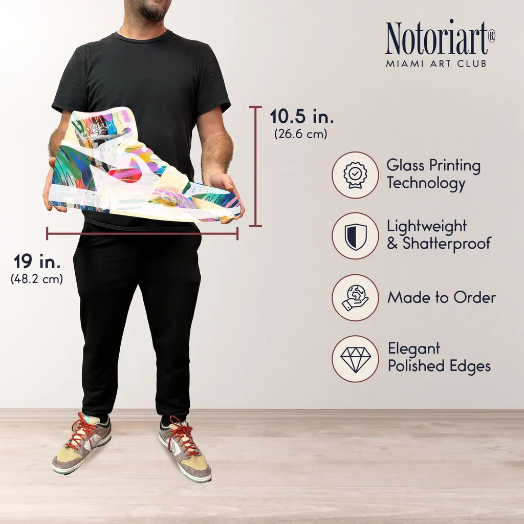 Discover the ultimate fusion of sneaker culture, street art, and high-end decor with NOTORIART's Acrylic Glass Sneaker Wall Art. This 19" x 10.5" masterpiece blends iconic sneaker designs with vibrant graffiti and hand-polished details. With just 2 small holes, this collectible piece includes 4 durable aluminum thumbtacks (2 black, 2 silver) for easy hanging—no complex tools needed. Ideal for sneakerheads and modern art collectors, this exclusive design is handmade to order in Miami, making it a bold statement piece for any space.Features: Interior Designer's Note: This collectible sneaker-shaped wall decor is crafted from precision-cut acrylic glass, showcasing vibrant graffiti elements and bold colors for a standout piece that energizes any room.Simple, Sleek Hanging Solution: With just 2 small holes and 4 sturdy aluminum thumbtacks provided (2 black, 2 silver), hanging this art is effortless. Push the thumbtacks into the wall—no drills or measuring required.Graffiti-Inspired Street Style: This high-quality, hand-polished acrylic glass art captures the raw energy of urban culture, making it a bold expression of modern street style and pop art.Premium Materials & Secure Packaging: Featuring a glossy, vibrant finish, each piece is securely packaged to ensure it arrives in flawless, collectible condition.Exclusive NOTORIART Collectible: Handcrafted in Miami, this limited-edition wall art is perfect for sneaker lovers and urban culture enthusiasts, serving as a unique expression of individuality.To preserve its high-gloss finish, clean with a soft, dry microfiber cloth. Avoid using water or sprays. Suitable for indoor use only.