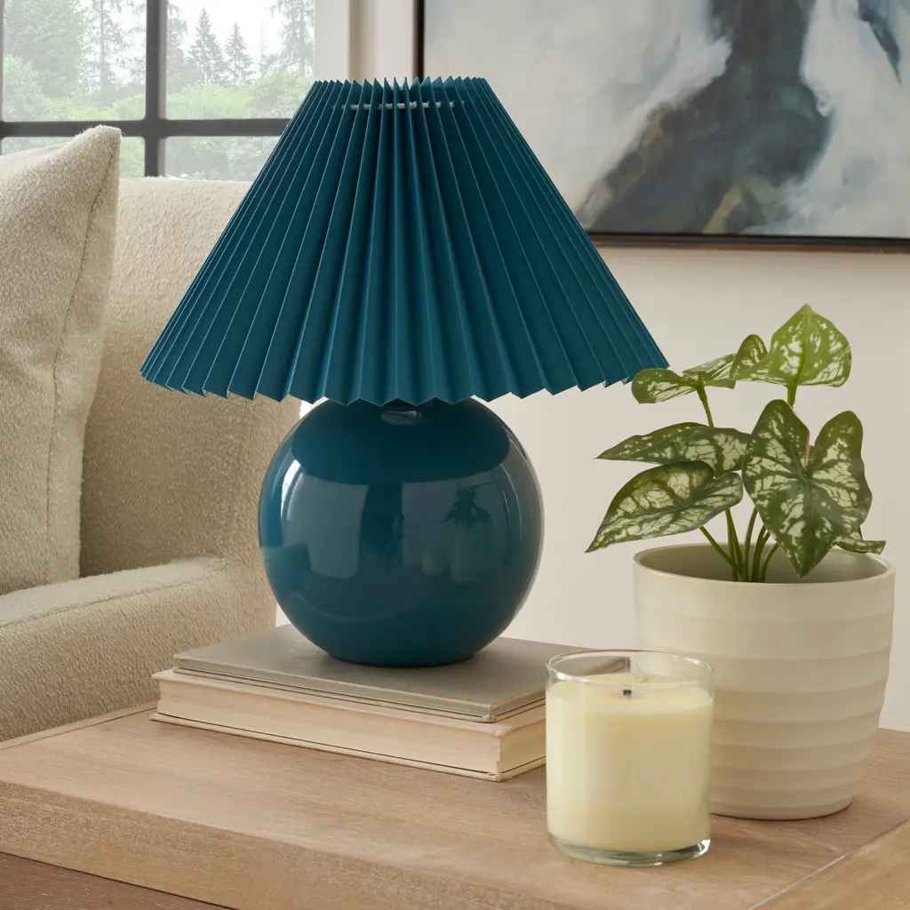 Nourison 13" Round Ceramic Table Lamp With Pleated Shade - Teal