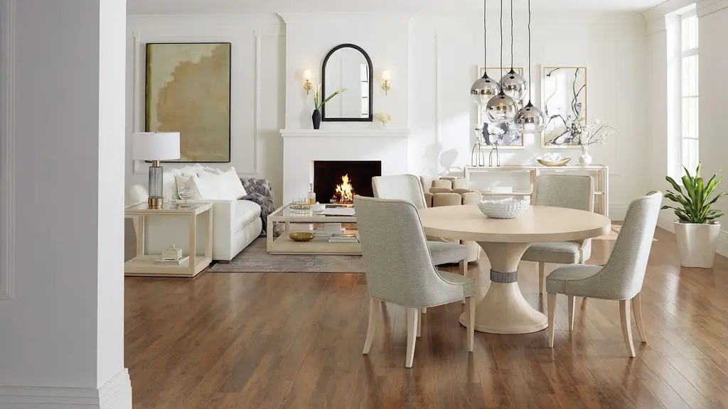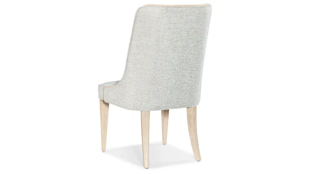 A slender, svelte silhouette, the upholstered Nouveau Chic Host Chair (set of 2) has a slipper design with wood trim along the sides and top of the back. The trim in Cathedral and Quartered Oak Veneers is finished in the serene Sandstone with wire brushing and a masterful combination of transparent and opaque stains. The Sand fabric is a silk-linen blend.