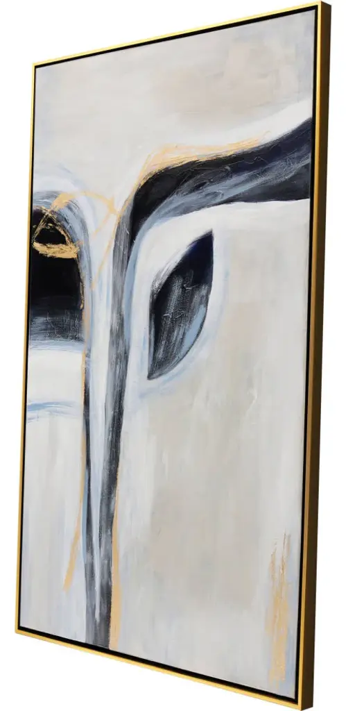 Exclusive hand painted canvas with gold leaf accents. Hand stretched and mounted in an antique gold wood floater frame.