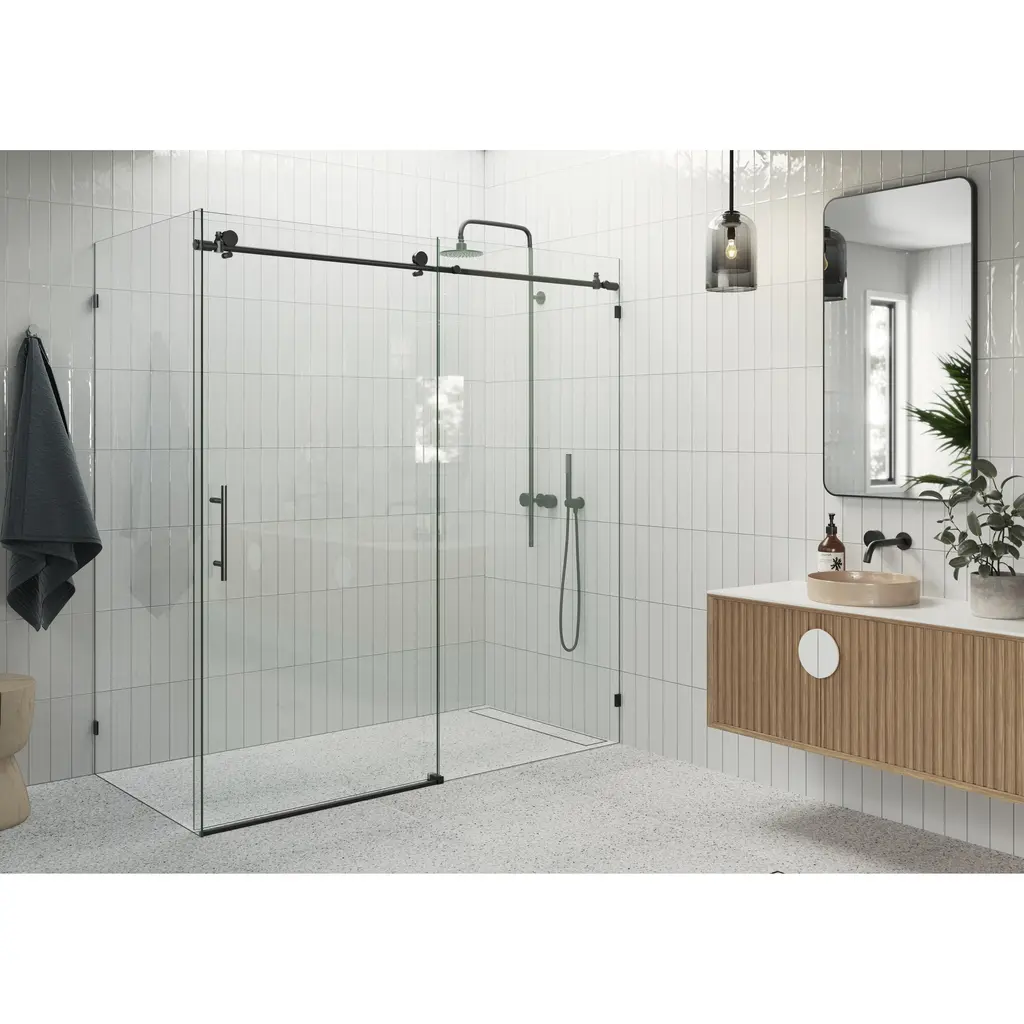 For a beautiful open-plan bathroom, the Nova, our high-end 90-degree sliding shower enclosure, makes the most of your space without compromising on style. Taller than most competitor shower stalls, each frameless 3/8" tempered glass panel comes in a standard 78" height. Glass is treated on both sides with EnduroShield coating, which aids in repelling water and soap residue, allowing the panels to be fully reversible. In addition, our superior quality solid brass hardware is available in a variety of color finishes to suit any bathroom. With our extensive range of frameless shower door and panel sizes, the Nova by Glass Warehouse creates a clean, custom look. A fixed panel adds strength, while the high-quality roller system allows the door to glide easily as you slide it open and closed. As a result, your bathroom will be transformed, making it feel bigger and brighter.