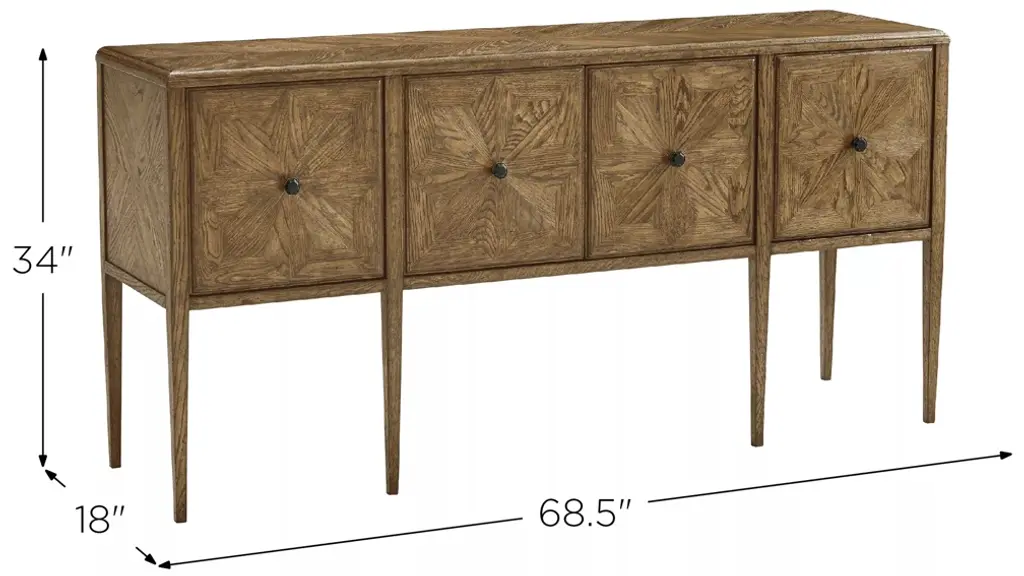 The radial star patterned veneer on the Nova Four Door Rectangular Credenza is strikingly charming. The mosaic-inspired doors and tapered oak legs seen here in our Dawn finish with the fine Verde Bronze finished hardware come together to create a uniquely sophisticated piece.