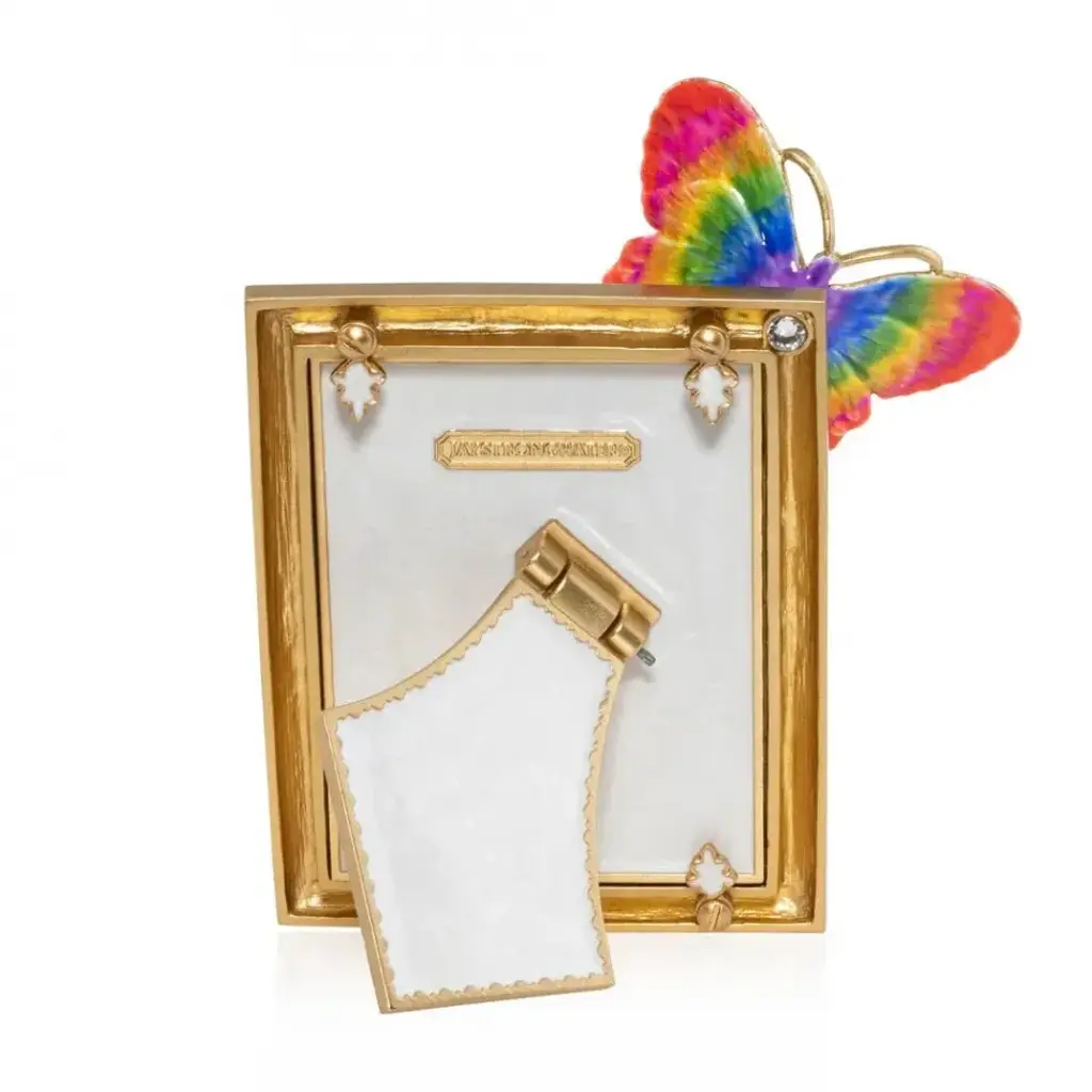 Our signature jeweled butterfly – hand-painted in rainbow enamels – pops on the corner of the Nova Butterfly Frame. Casted in pewter, finished in 14K gold, and hand-set with sparkling Swarovski champagne crystals. With our signature, all cream enamel back plate – this frame is truly beautiful from any view. Stands vertically or horizontal.