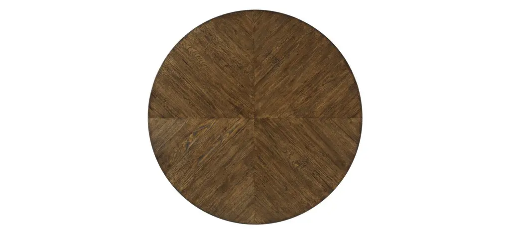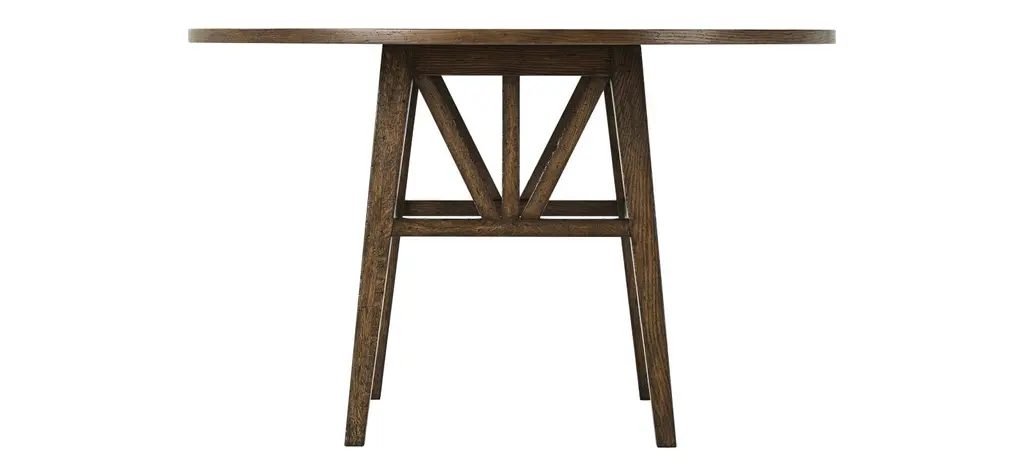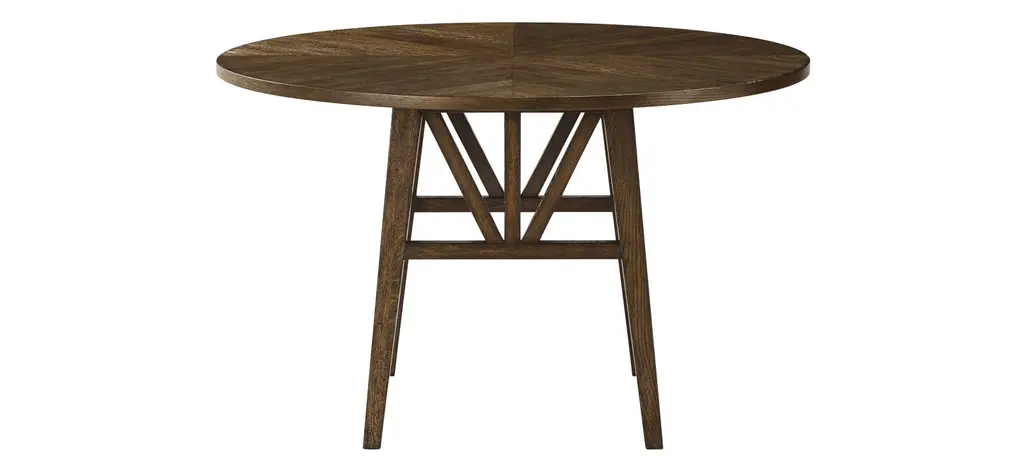 Striking and bold, Nova's oak parquetry round dining table displays an over flat truss and reinforcing oak stretcher that captures the eye in our Dusk finish. Seen with a radial designed oak top on a classically tapered leg.