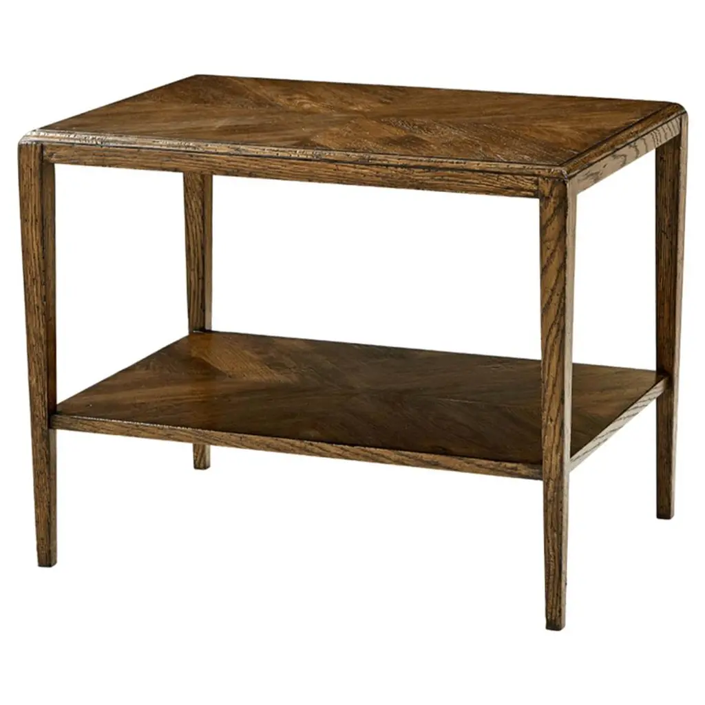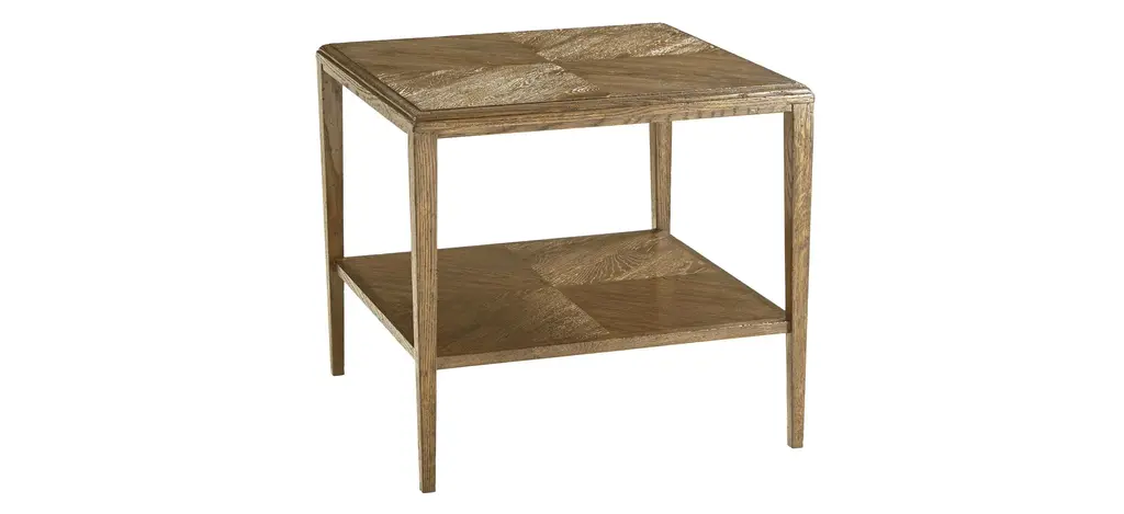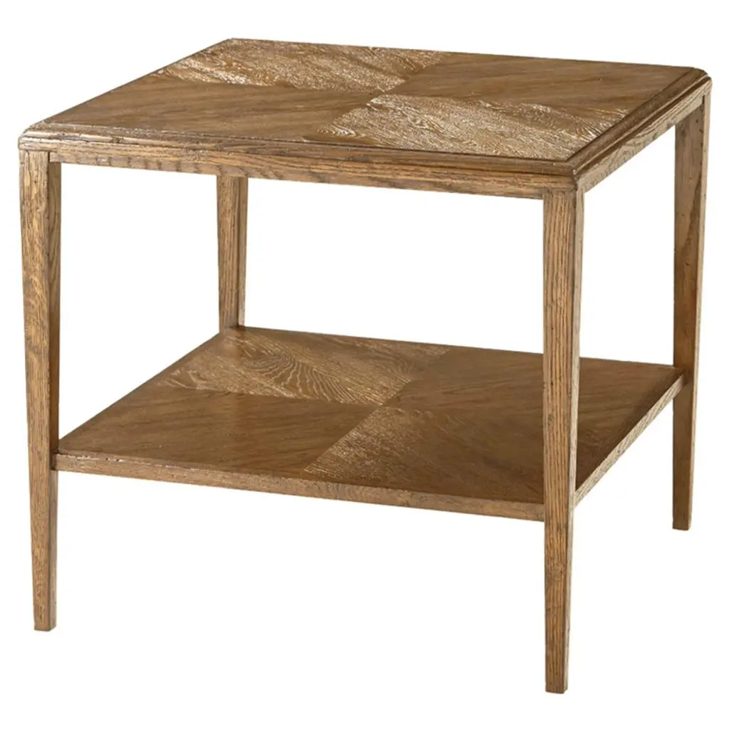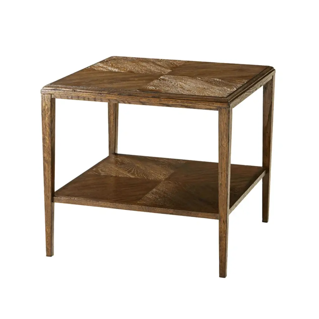 Nova's Square Side Table exhibits an original oak parquetry patterned top and bottom tier, highlighted by our Dusk finish and joined with a rustic tapered oak leg.