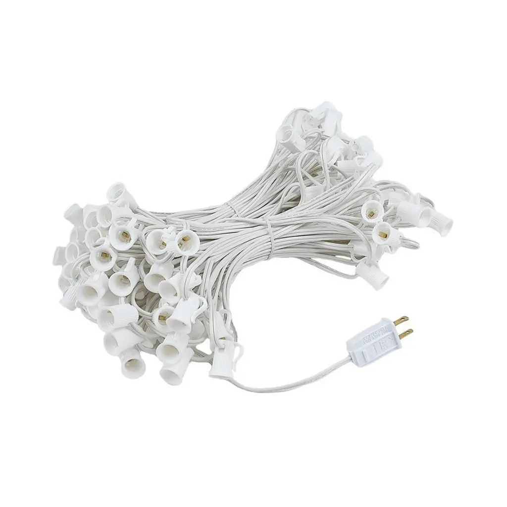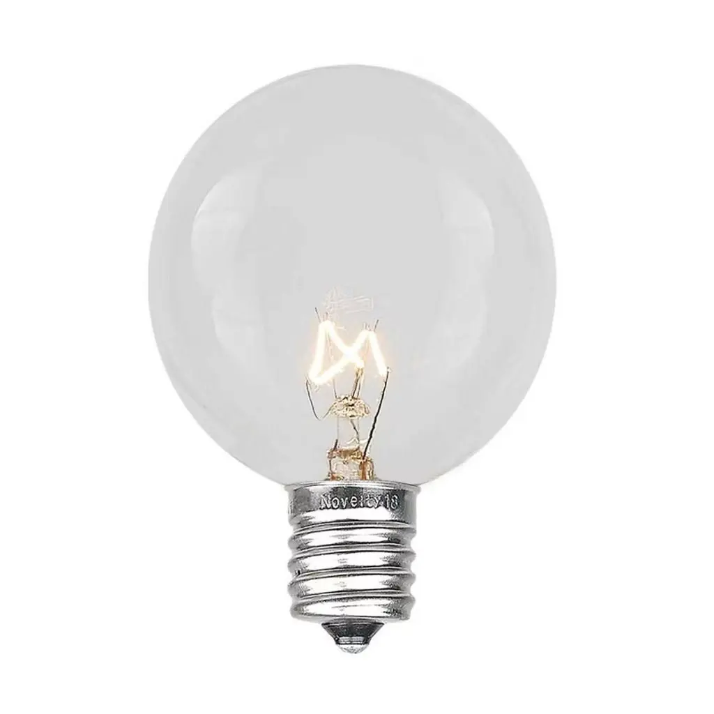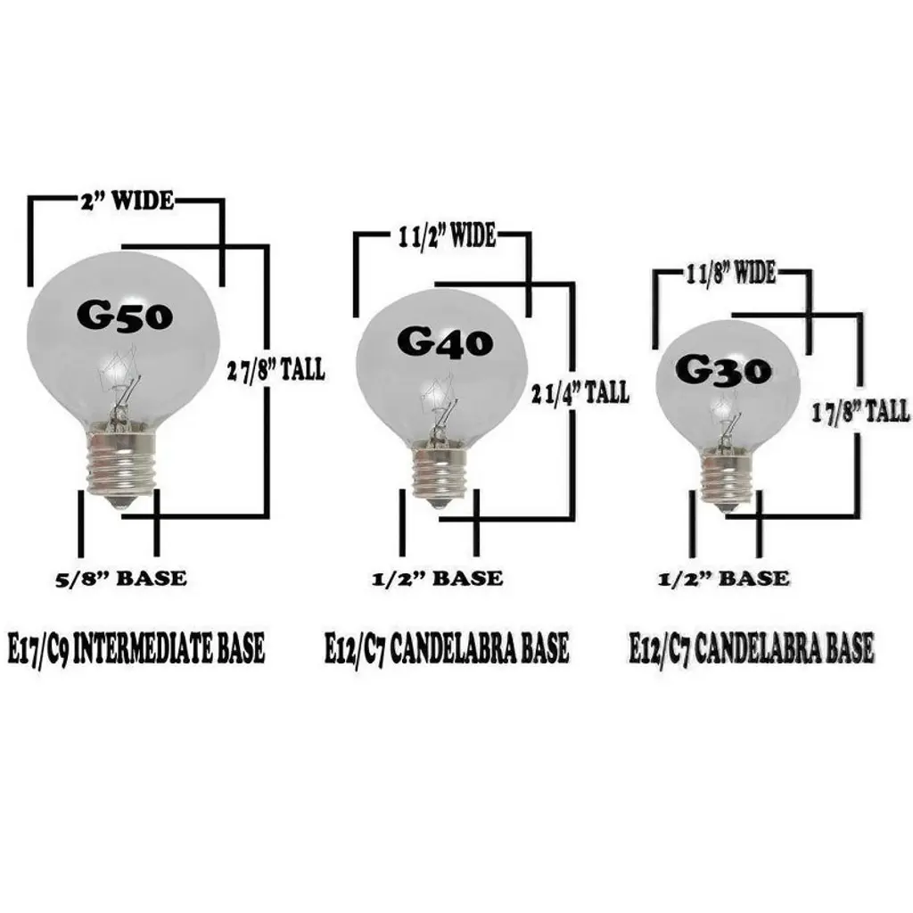 Buy Novelty Lights 100 bulb G40 globe string light sets to illumiate your outdoor garden, patio, deck, yard, or special event space. Each set includes 125 round G40 globe bulbs and a 100 foot heavy-duty SPT-1 20 gauge stringer with 100 sockets that are spaced 12" apart. With 125 bulbs, these sets include 25 extra bulbs at an excellent value. These G40 globe string light sets have long-lasting 3000 hour bulbs and are on a durable 20 gauge wire. All of our G40 light strings use patented Admiral Brand sockets. These durable and heavy duty light strings will provide you with years of maintenance-free use.