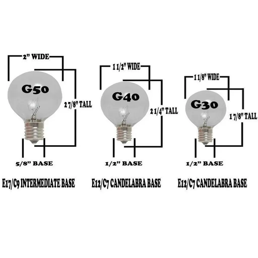 Novelty Lights G40 globe string light set on commercial grade wire with 25 bulbs, perfect for outdoor patios, decks, special event or christmas lighting. Each set includes 25 round bulbs on a 20 gauge SPT-1 wire stringer with 25 sockets that are spaced 12" apart. These globe shape G40 light strings have long lasting 3,000 hour incandescent vintage filament light bulbs. These durable and heavy duty light strings will provide you with years of maintenance free use. Each bulb is 2" wide by 2-7/8" tall and roughly about the size of a racquet ball. Connect 3 sets end-to-end for a total of 75' on one plug. Indoor and outdoor rated.