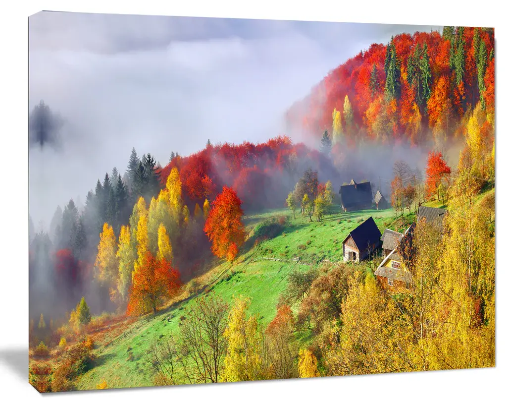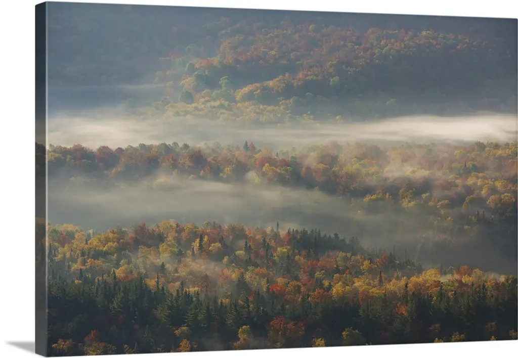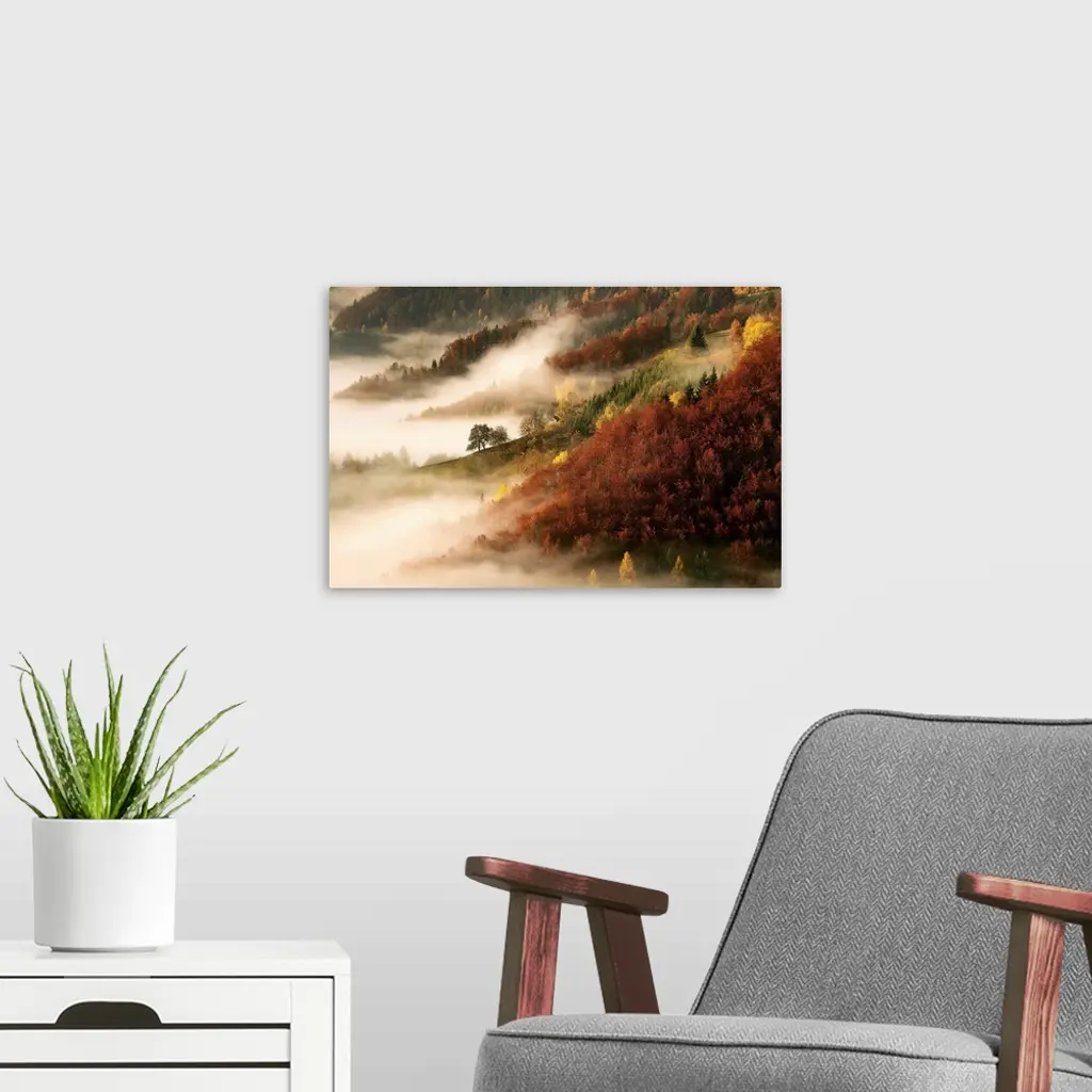 Forests on a hillside emerging out of a dense fog in autumn.