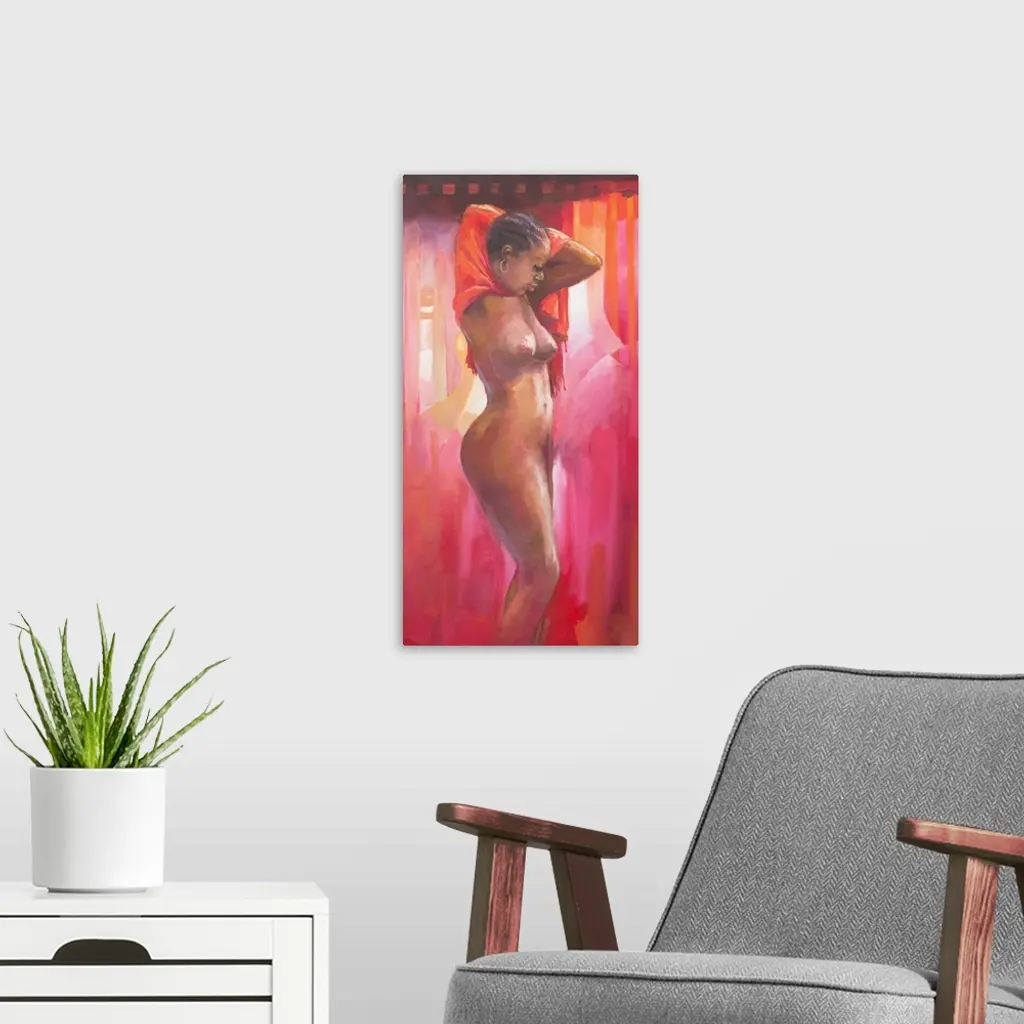 Returning home after a hard day, a woman takes off her work clothes when she arrives home. She is surrounded by bright shades of red that cast a mood of intimacy. Mark Buku paints her vivid portrait with a palette of intense acrylic colors.