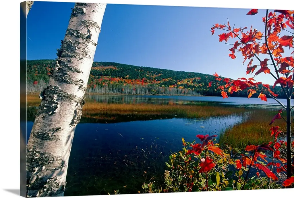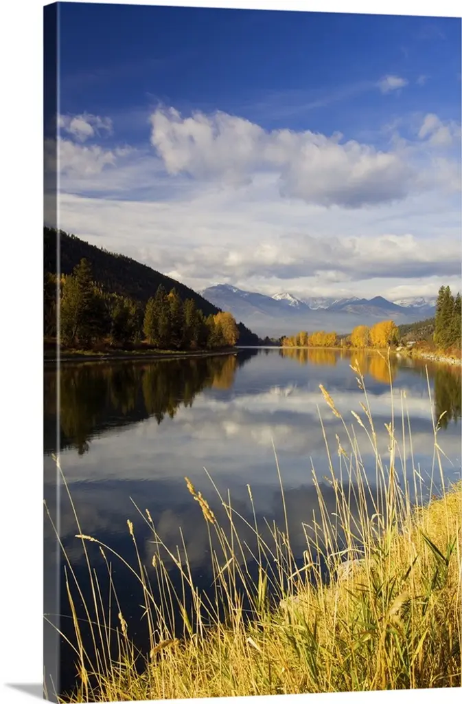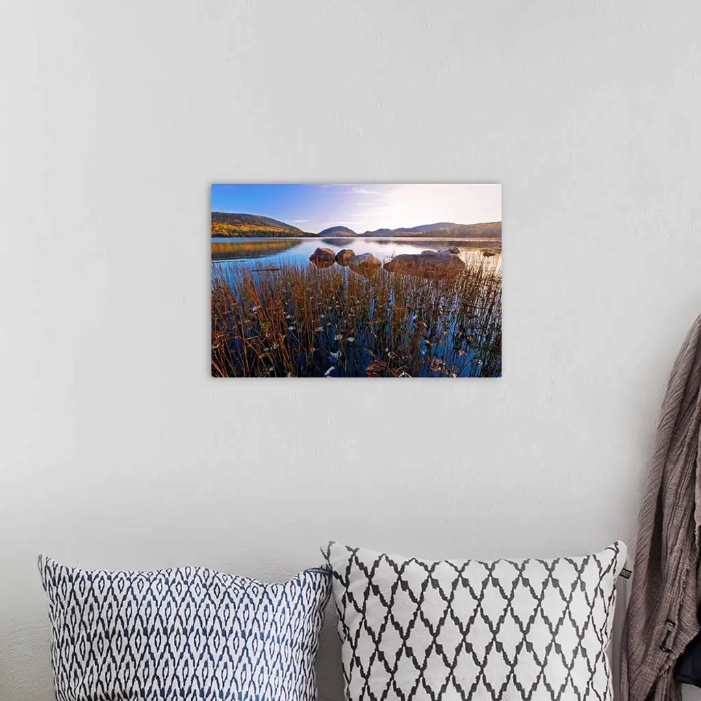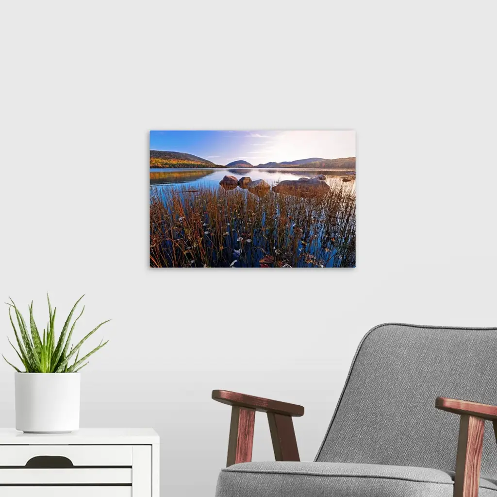 This large piece is a photograph taken over a large body of water with a scenic view of hills in the distance. Tall grass stands in the foreground of the picture that is growing out of the water.