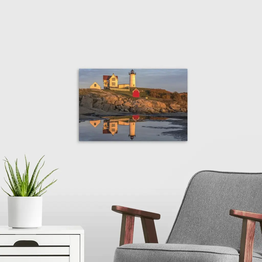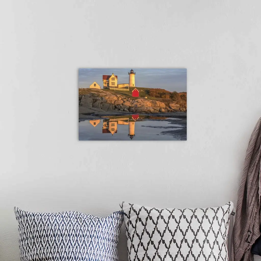 Nubble Lighthouse on a rocky cliff at sunset in Cape Neddick, Maine, reflected in the ocean water below.
