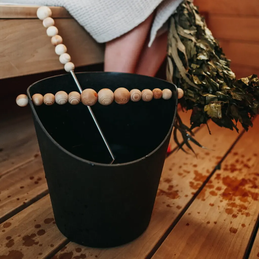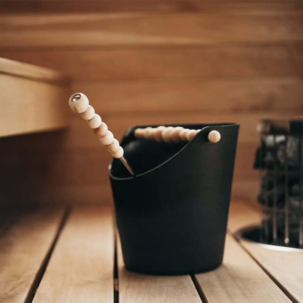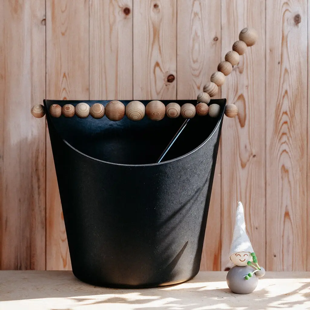 Aarikka's Nuppu sauna bucket blends traditional Finnish craftsmanship with a contemporary touch. Crafted from lightweight and eco-friendly biocomposite, the bucket’s materials are sourced from wood industry by-products. The surface features natural cellulose fibers that give the bucket its unique texture, while the handle showcases Aarikka's signature chunky wooden beads. For added versatility, the bucket can also be filled with ice and used as a cooler for sauna drinks or other refreshments. Pair it with the matching Nuppu sauna ladle for a complete set.