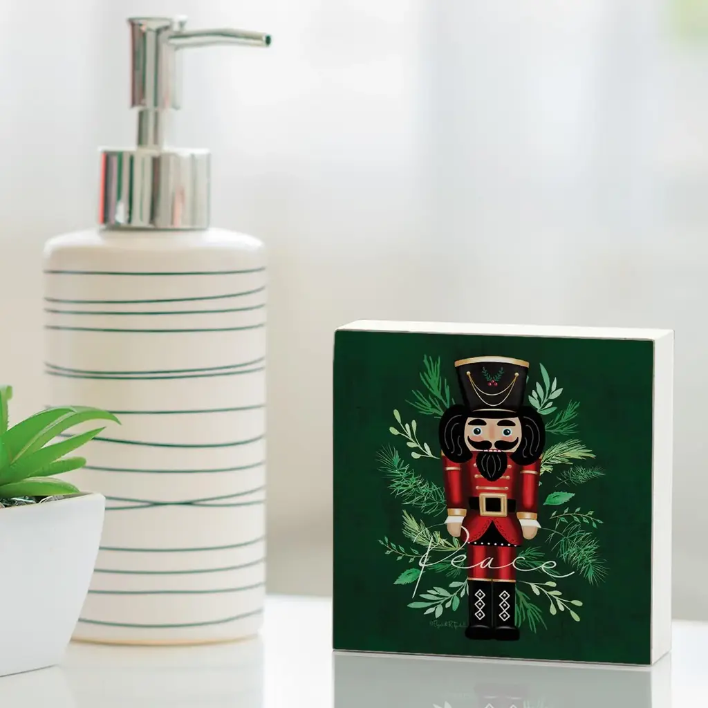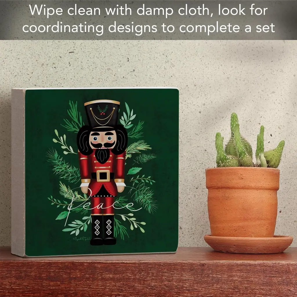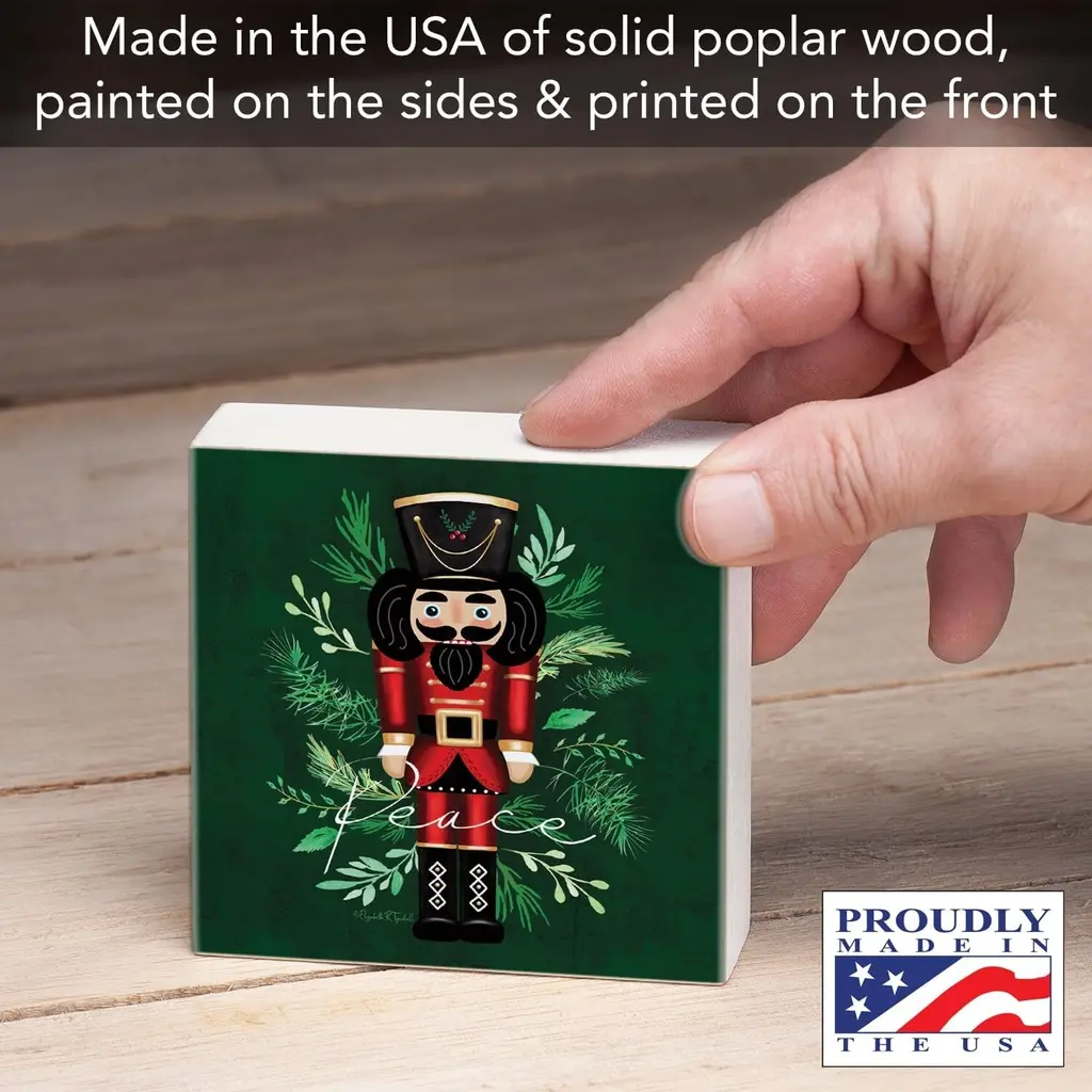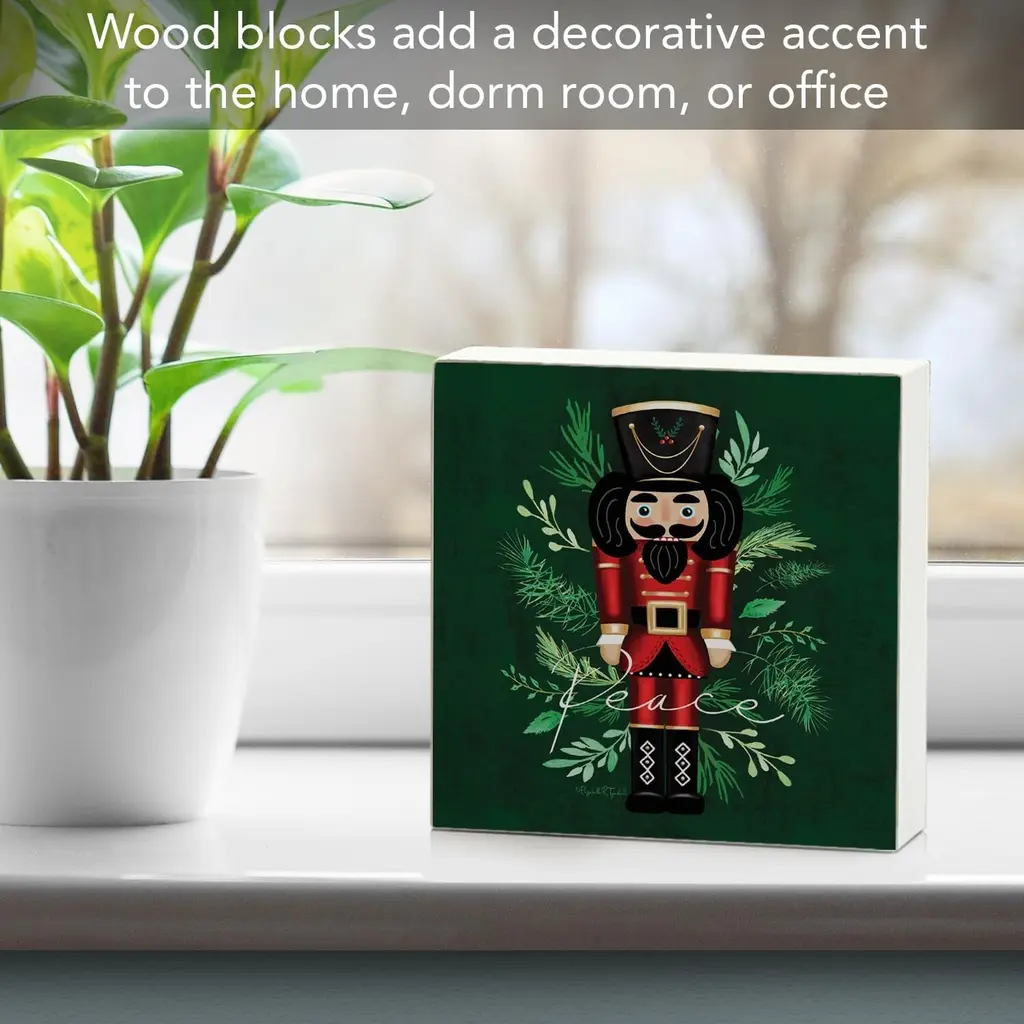 Nutcracker Artistic Freestanding Solid Wood Block Sign. Artistic Solid Wood Block Signs add a decorative colorful touch to any space. Each wooden sign measures 3.75" x 3.75" x .9". Constructed of solid Poplar Wood. Sign is transfer printed on the front. Sides are painted white. Wood back is kept natural. Sign is sized to fit into any space whether large or small. Display on a shelf, desk, or mantle. Use these attractive signs to create a new design or add to spruce up an existing design. Look for our other coordinating wood block designs to make your own collection. Freestanding Wood Sign.