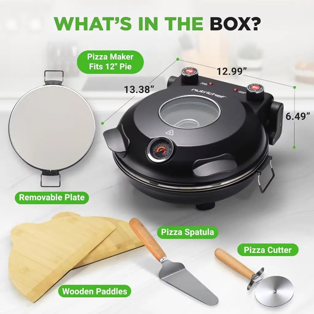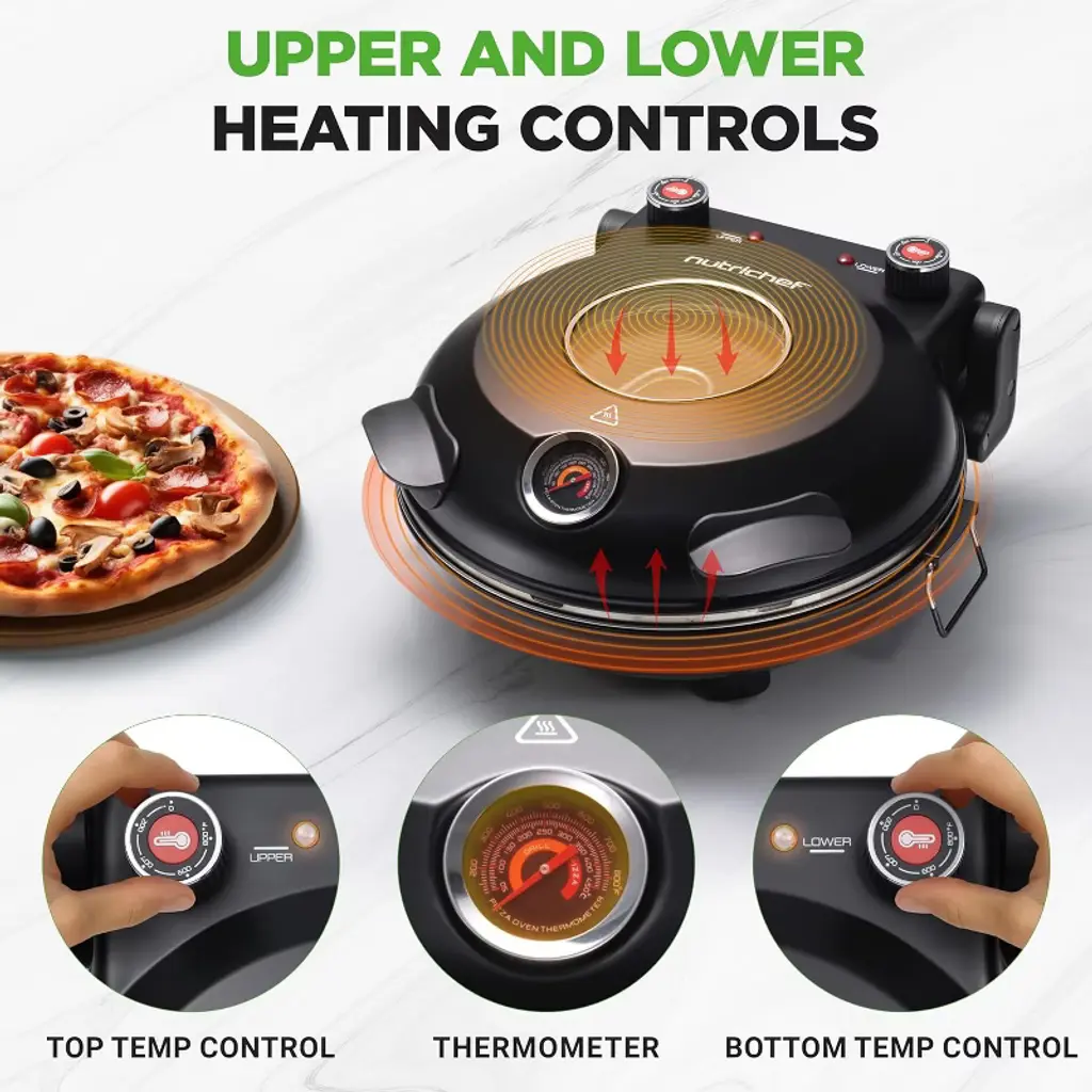 The NutriChef countertop pizza maker in black features independent temperature controls for the top and bottom heating elements, allowing customizable and even baking. It includes a built-in thermometer and a large viewing window for easy monitoring. Cool-touch handles and overheat protection provide safety during use. Compact and space-saving, this electric pizza oven is perfect for home kitchens. Included are essential pizza prep accessories: a wooden paddle, cutter, and spatula. With a 40 oz. With capacity and durable stainless steel and aluminum construction, it delivers professional-quality pizza baking.