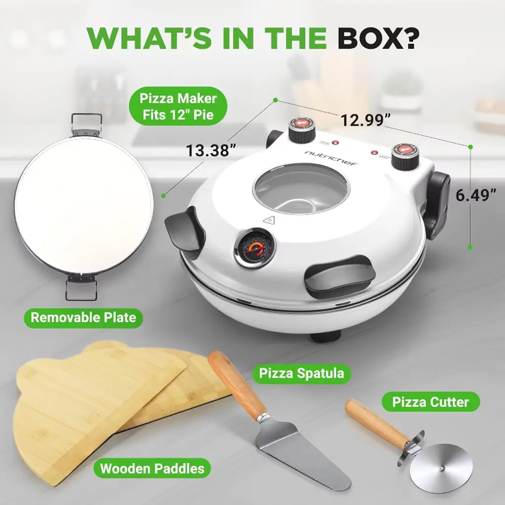 The NutriChef countertop pizza maker in ivory white features independent temperature controls for the top and bottom heating elements, enabling even and customizable cooking. The built-in thermometer and large viewing window help monitor your pizza as it bakes, while cool-touch handles and overheat protection prioritize safety. Its compact, space-saving design fits comfortably on kitchen countertops. Included accessories, such as a wooden paddle, cutter, and spatula, make pizza preparation easy and complete. With a 40 oz. With capacity and durable stainless steel and aluminum construction, this electric pizza oven delivers professional results at home.