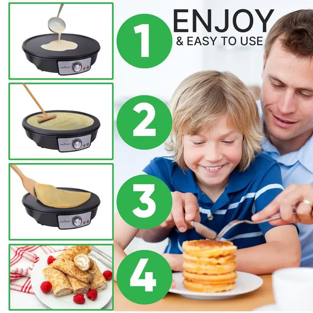 The NutriChef Electric Crepe Maker & Griddle provides you with convenient food prep ability. The compact tabletop design is easy to use, allowing you to create delicious desserts like crepes and blintzes -- or use it to whip up a quick breakfast including bacon, eggs & pancakes! The non-stick aluminum cooking surface features a wide 12'' inch diameter cooking surface with a temperature adjustable rotary control knob. Enjoy hassle-free hot plate food preparation with the NutriChef Electric Crepe Maker & Griddle.