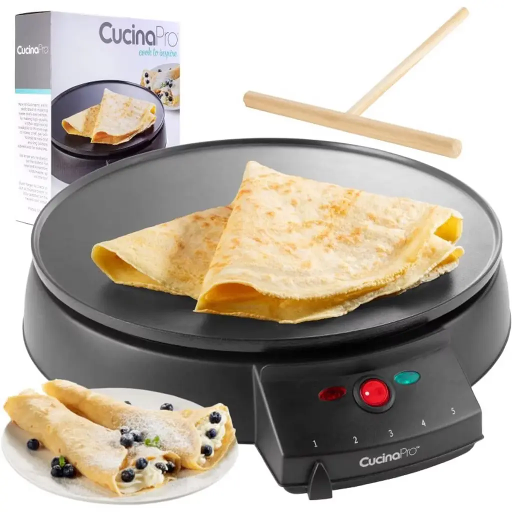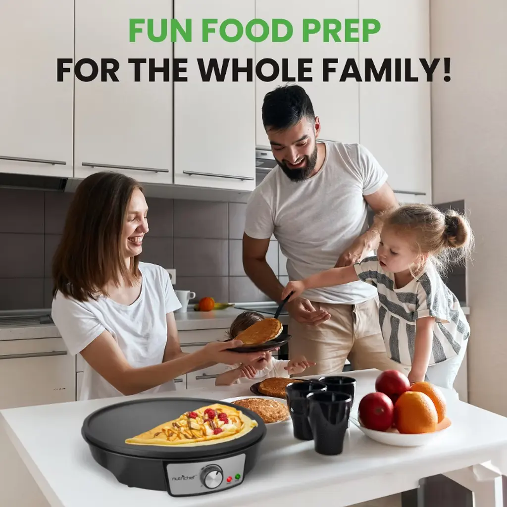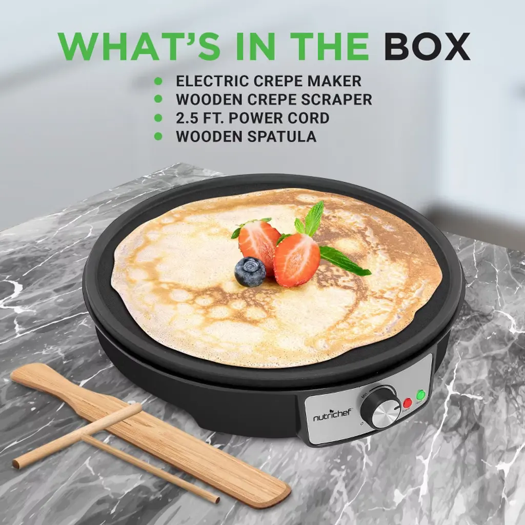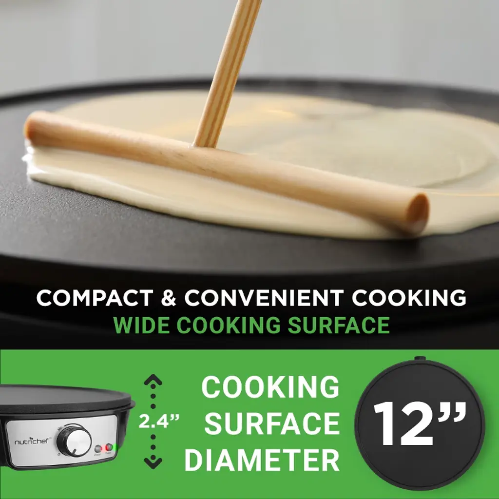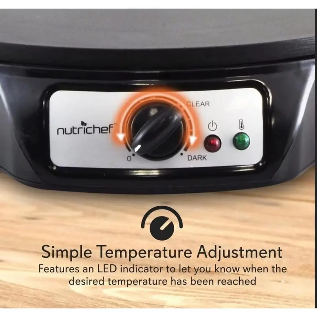 The NutriChef Electric Crepe Maker & Griddle provides you with convenient food prep ability. The compact tabletop design is easy to use, allowing you to create delicious desserts like crepes and blintzes -- or use it to whip up a quick breakfast including bacon, eggs & pancakes! The non-stick aluminum cooking surface features a wide 12'' inch diameter cooking surface with a temperature adjustable rotary control knob. Enjoy hassle-free hot plate food preparation with the NutriChef Electric Crepe Maker & Griddle.