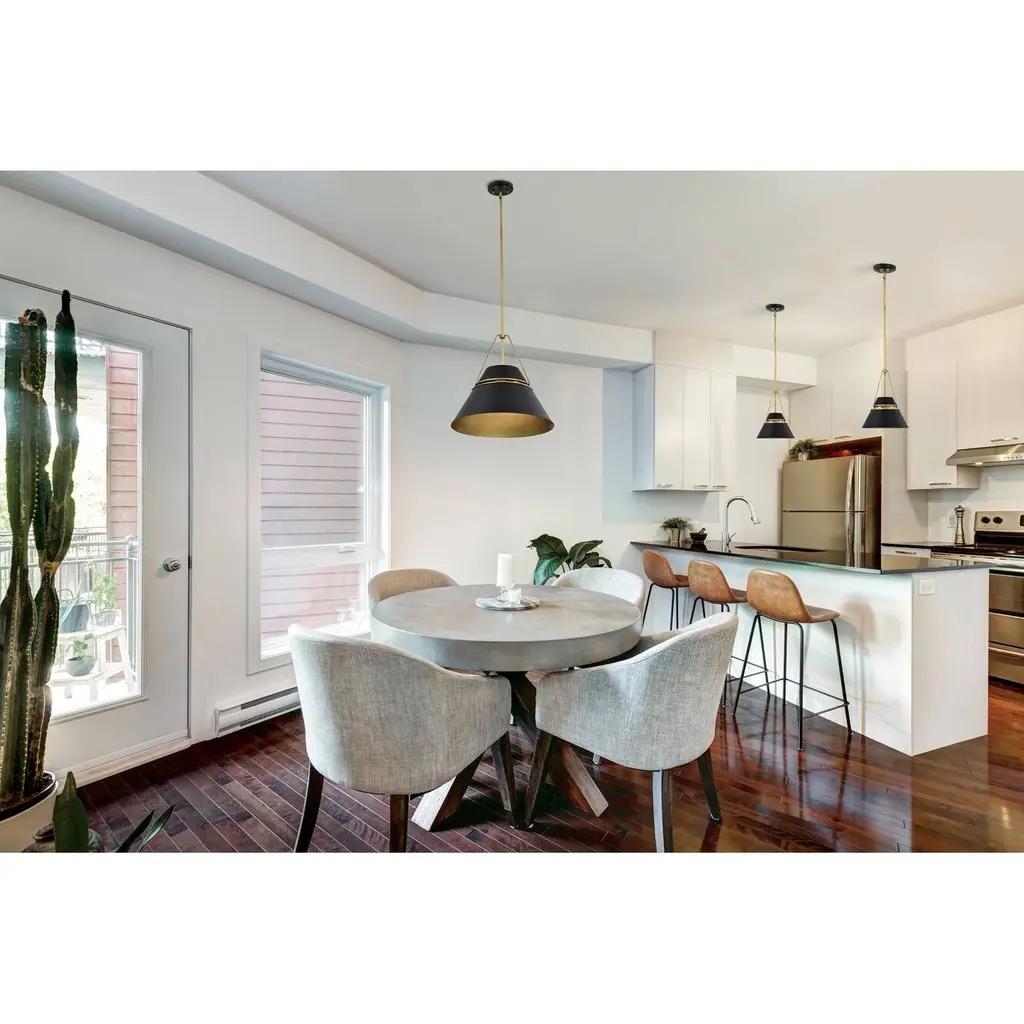 A stunning medium-sized pendant that blends contemporary style with streamlined design elements, Adina 60-7766, is effortless-lighting at it's finest. Complimented with accents, the finish is sleek, showcasing its clean lines. Housed within a beautifully crafted metal shade, the-light casts a warm and inviting glow when illuminated. A versatile fixture with a minimalist appeal, making it a great choice for those who want to create a modern and understated look in their home decor.Features:Dimensions:Electrical Specifications: