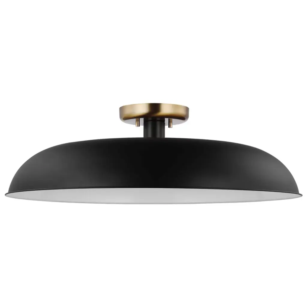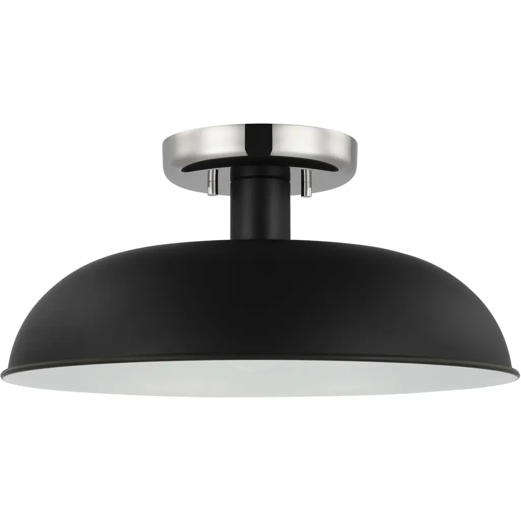 Collection: Colony, Material: Steel, Finish Color: Matte Black/Polished nickel, Width: 24", Height: 7.63", Lamping Type: Incandescent, Number Of Bulbs: 1, Wattage: 60 Watts, Dimmable: No, Moisture Rating: Dry Rated, Desc: Designed with neutral, clean lines, the Colony 60-7496 large semi-flush is ideal for an eat-in kitchen, entryway, hallway and even a bedroom. The loft-style shallow pan metal shade is done in matte white, with a matching interior to reflect the downfacing lamp. The burnished brass finish on the canopy adds an elegant touch to this flexible design. Uses one 60-watt incandescent medium base bulb Fixture measures 24 inch diameter x 7.625 inch height Rated for indoor use in dry locations Finished in matte white with burnished brass accents and matching metal shade Mounting hardware and installation instructions included Limited one year fixture warranty. Canopy Included: Yes / Canopy Diameter: 5.75 / Shade Included: Yes / Shade Dimensions: 24.02 x 6.5. ,