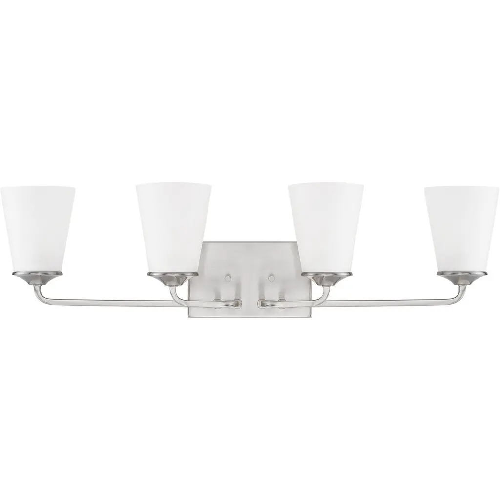 Collection: Mobili, Material: Glass, Finish Color: Brushed Nickel, Width: 34.63", Height: 7.88", Depth: 6.88", Number Of Bulbs: 4, Wattage: 100 Watts, Dimmable: No, Moisture Rating: Damp Rated Desc: Mounting Direction: Up/Down / Shade Included: TRUE / Warranty: One Year. , Material: Glass, Finish Color: Brushed Nickel, Width: 34.63", Height: 7.88", Depth: 6.88", Number Of Bulbs: 4, Wattage: 100 Watts, Dimmable: No, Moisture Rating: Damp Rated