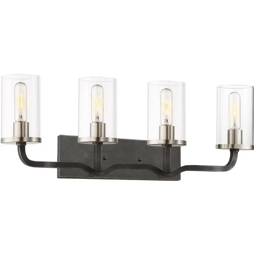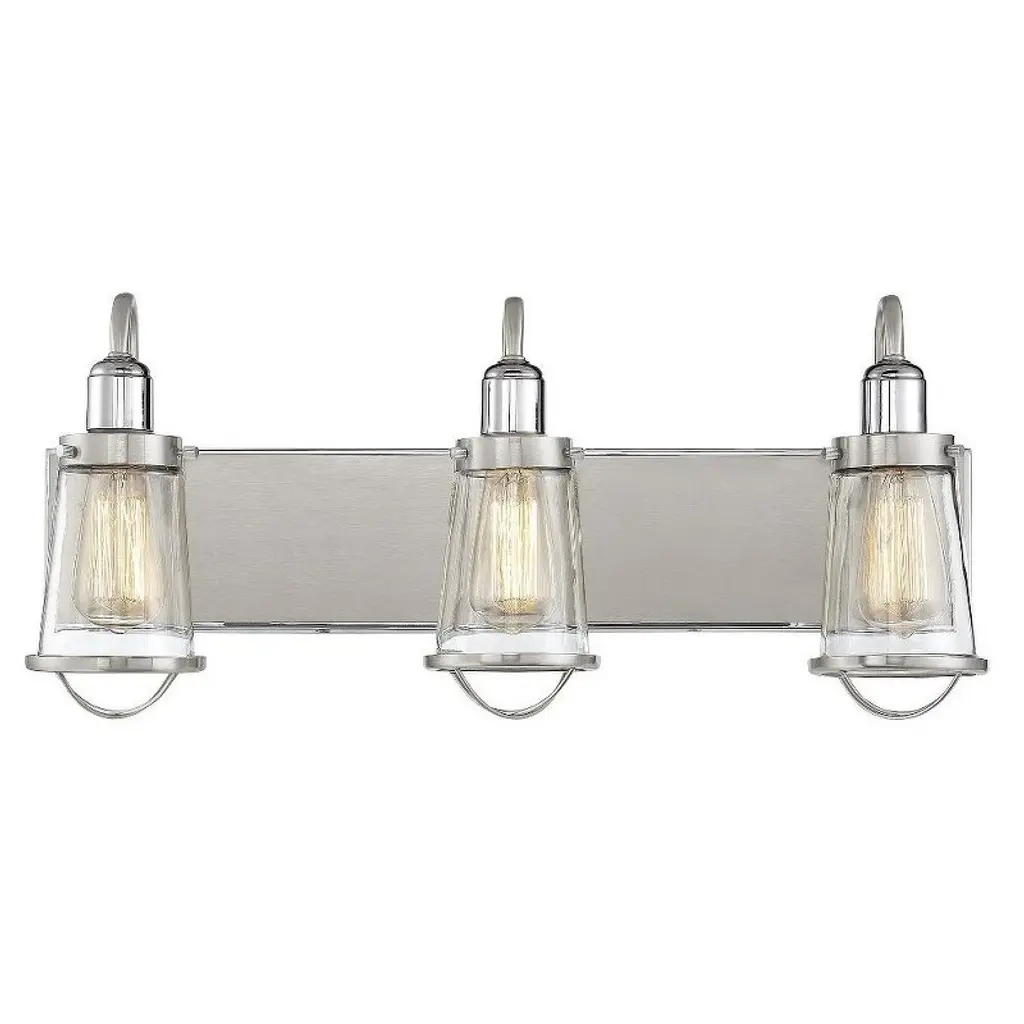 Collection: Sherwood, Finish Color: Iron Black/Brushed Nickel, Width: 24", Height: 10.38", Depth: 8.63", Number Of Bulbs: 3, Wattage: 40 Watts, Moisture Rating: Damp Rated, Desc: Dimmable: TRUE / Warranty: 1 Year Limited / Color Temperature: 2700 / Lumens: 480 / CRI: 100 / Rated Life: 3000 Hours. ,