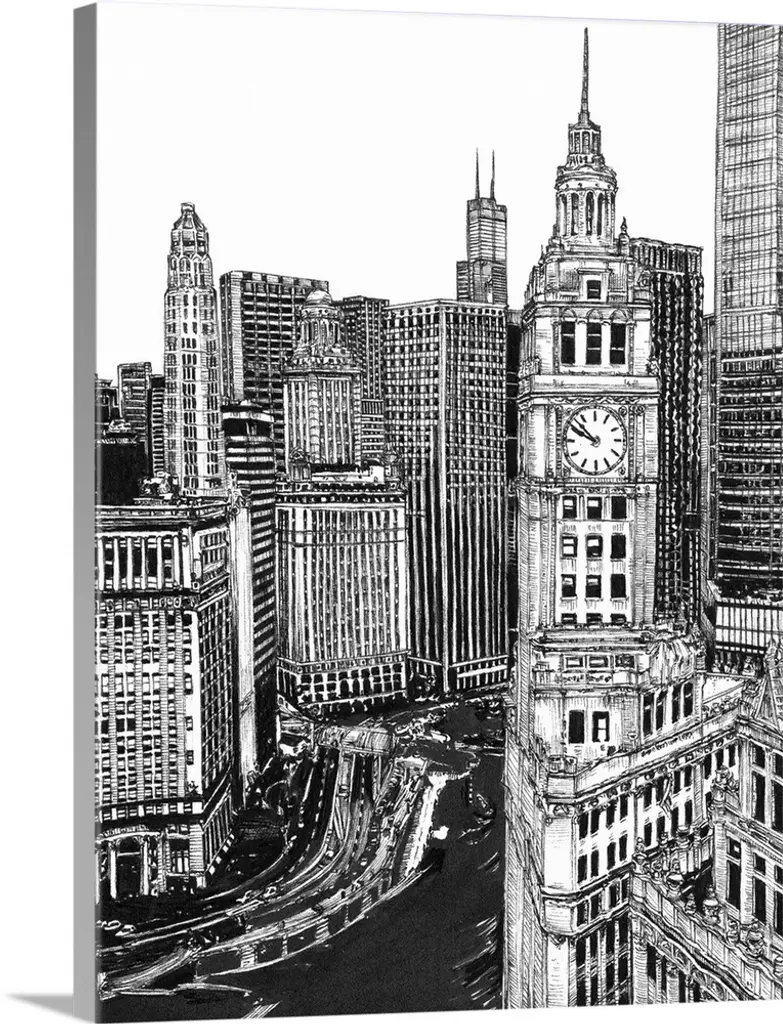 Bold lines and geometric shapes reveal the details of everyday buildings in this cityscape.