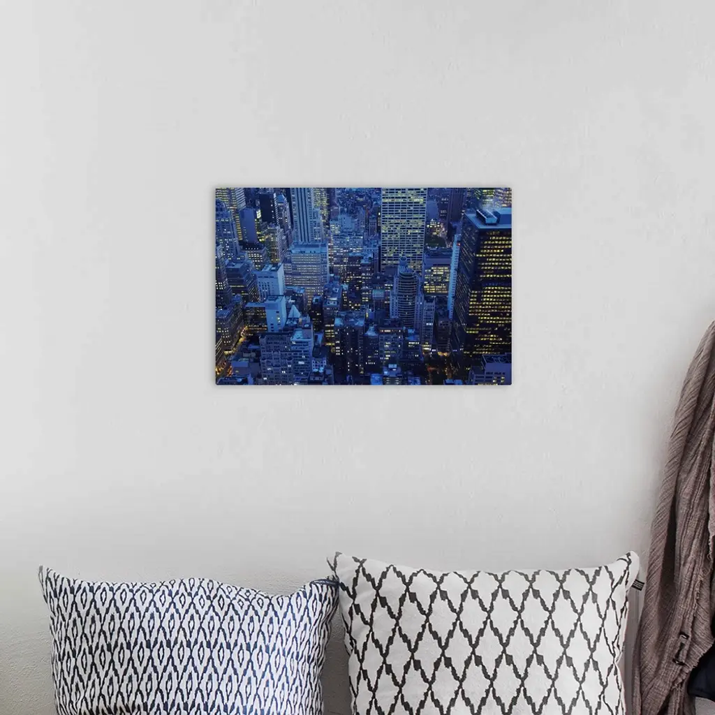 This photograph is looking down from a skyscraper at smaller building lit up for the night.