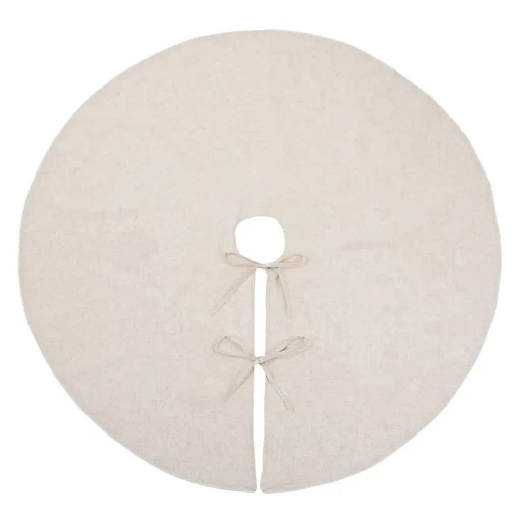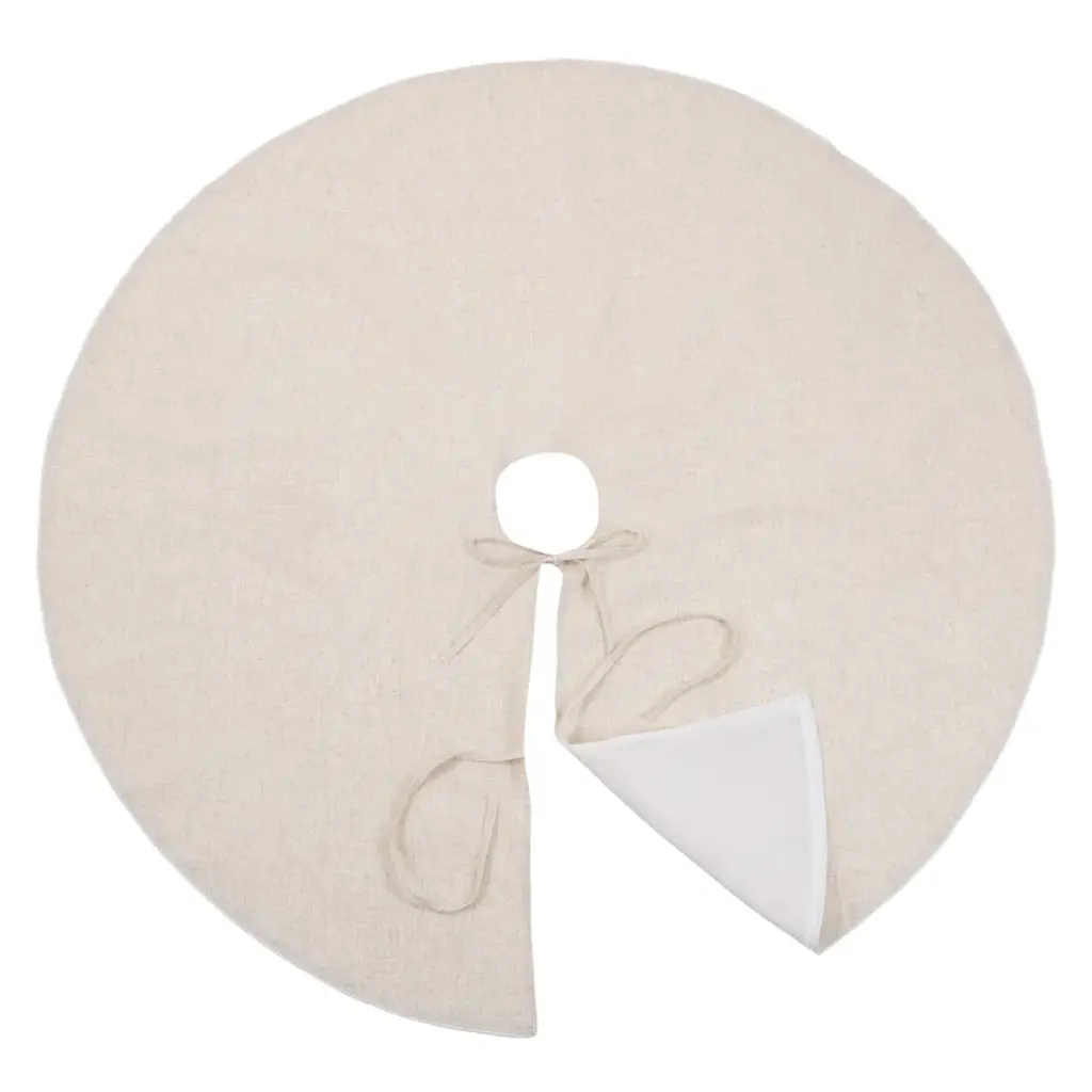 This tree skirt features a simple design that catches those pesky pine needles during the holidays. It's crafted from a polyester and linen blend with a crisp cream hue that complements your coastal farmhouse decor. This skirt has a circular silhouette with a slit opening to easily place around the bottom of your tree, while double-tie closures allow you to secure it. We love how the piping around the border contrasts nicely with the white skirt. As a bonus, this piece is machine washable for quick and easy upkeep.